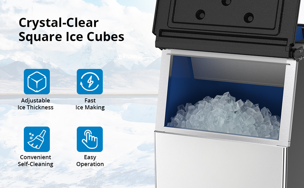 【سُمك مكعبات الثلج قابل للتعديل】الحجم القياسي لكل مكعب ثلج لآلة صنع الثلج التجارية هو 0.9 بوصة × 0.9 بوصة × 0.9 بوصة، ولكن يمكن تعديل سُمك مكعب الثلج عن طريق زيادة أو تقليل وقت صنع الثلج، حتى تتمكن من ذلك. احصل على سماكات مختلفة لمناسبات مختلفة. عملية صنع الثلج هادئة وفعالة.
