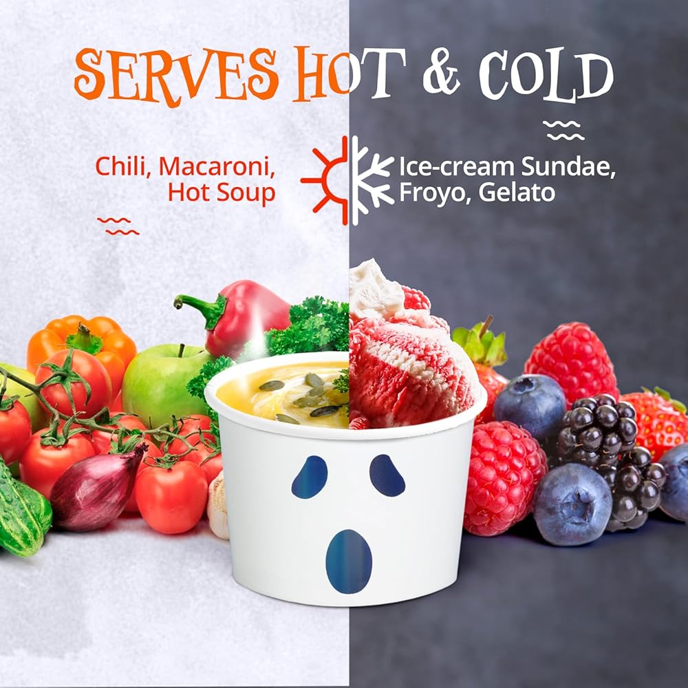 Serve various hot or cold treats with our Paper Ice Cream Cups. Designed for ice cream shops, concession stands, diners, restaurants, and bakeries, this versatile paper bowl is perfect for serving ice cream, frozen yogurt, chili, clam chowder, and other menu favorites. Its capacity allows users to easily pile on toppings or add an extra scoop of ice cream! These cups are made of a sturdy paperboard material to ensure it retains their shape. In addition, the cup's interior and exterior feature a polyethylene coating for outstanding leak resistance to prevent condensation from weakening the paperboard. Plus, it is disposable for easy cleanup after use. This set of paper dessert cups is great for more than just ice cream, sundaes, or frozen yogurt. Serve up just about anything from candy cups, corn in a cup, microwave cake, and even cereal! We are dedicated to providing you with quality party supplies and serving solutions at the best possible prices. Explore our vast collection of paper ice cream cups in various sizes, colors, and designs for your every need!