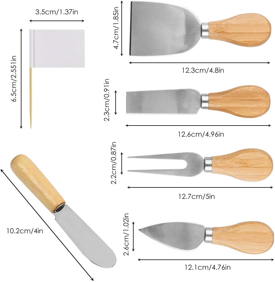 مجموعة أدوات توزيع سكاكين الجبن بمقبض خشبي من DaKuan مع أعلام مسواك فارغة، مجموعة سكاكين بهار قطاعة الجبن 10 قطع و100 قطعة من علامات الجبن ذات الأعلام البيضاء
