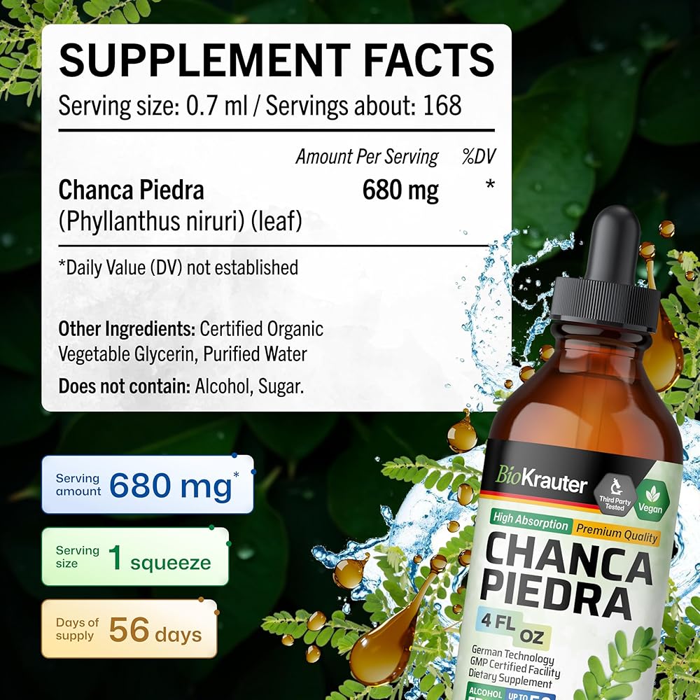 صبغة شانكا بيدرا للكلى: سائل تحطيم الحجارة BioKrauter، المصنوع من Phyllanthus niruri (المعروف باسم كسارة الحصى)، يدعم صحة الكلى من خلال تعزيز تطهير المرارة.