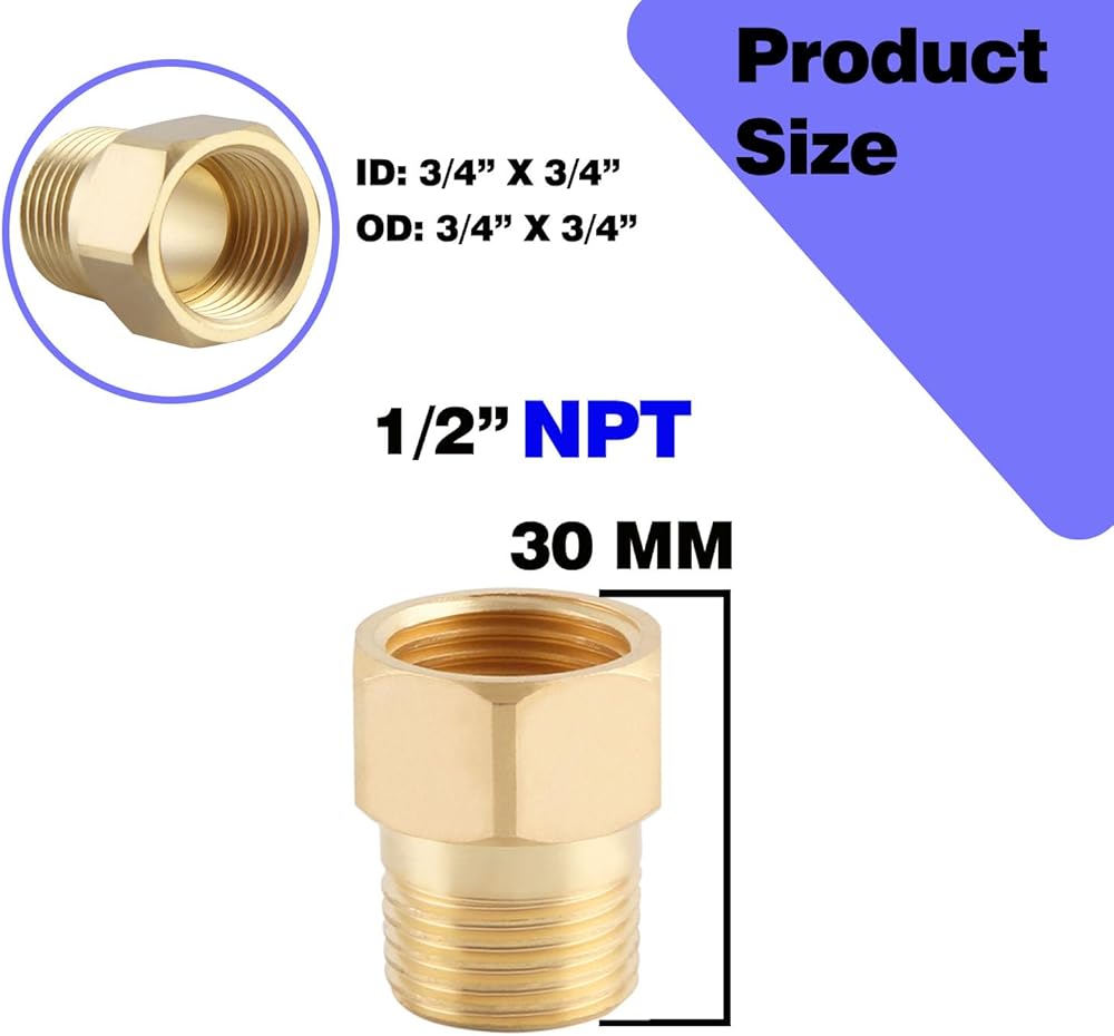 [THREAD SIZE CHECK]: This brass pipe extension set features 1/2 inch male to 1/2 inch female fittings in three lengths: 30mm, 40mm, and 50mm (OD: 0.76 inch). Note that the 30mm extension has NPT (tapered) threads, while the 40mm and 50mm extensions have NPS (straight) threads with no taper. PLEASE NOTE, NPT Taper Thread Size is a nominal pipe size and it does not represent the actual diameter. Please look the size chart for the specific thread diameter. NPT thread has a 60° taper, so usually unable to screw the thread to the end.
