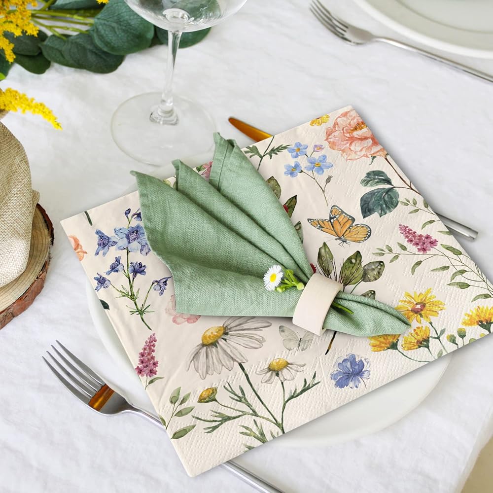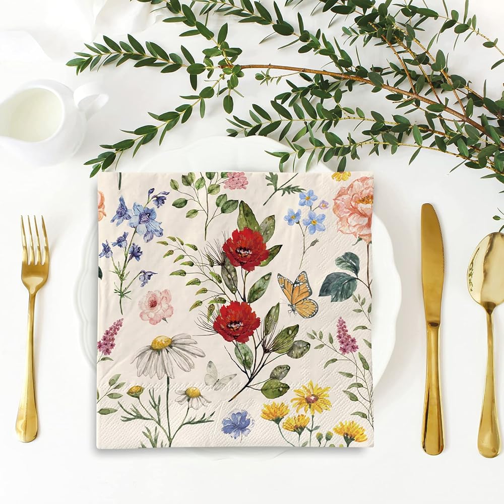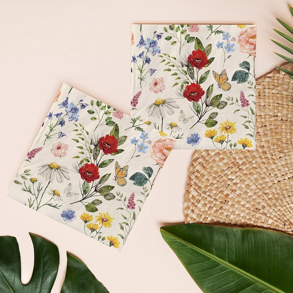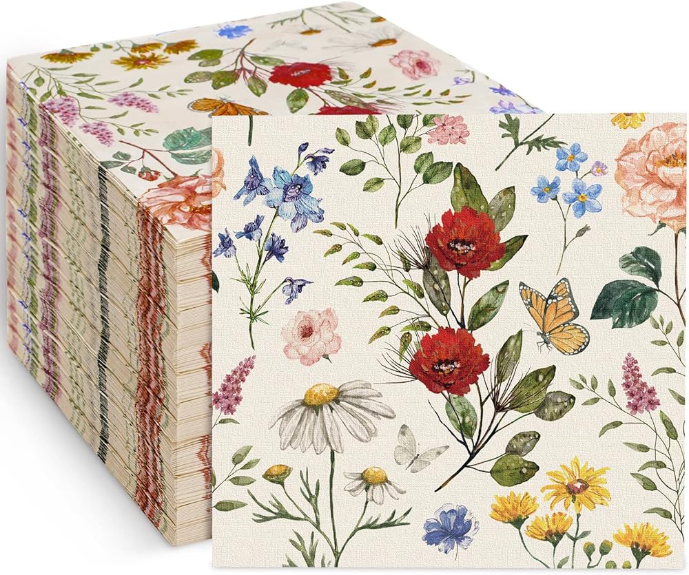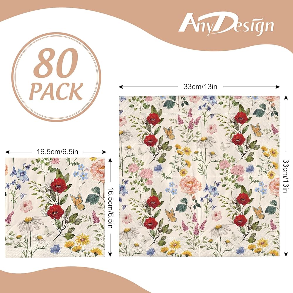 80 عبوة من مناديل ورقية زهرية عتيقة للاستعمال مرة واحدة من مناديل غداء على شكل زهرة برية مقاس 6.5 × 6.5 بوصة، منديل يدوي لحلوى الأزهار الرجعية لحفلات أعياد الميلاد وحفلات الزفاف وحفلات استقبال المولود الجديد (فراشة زهرة)