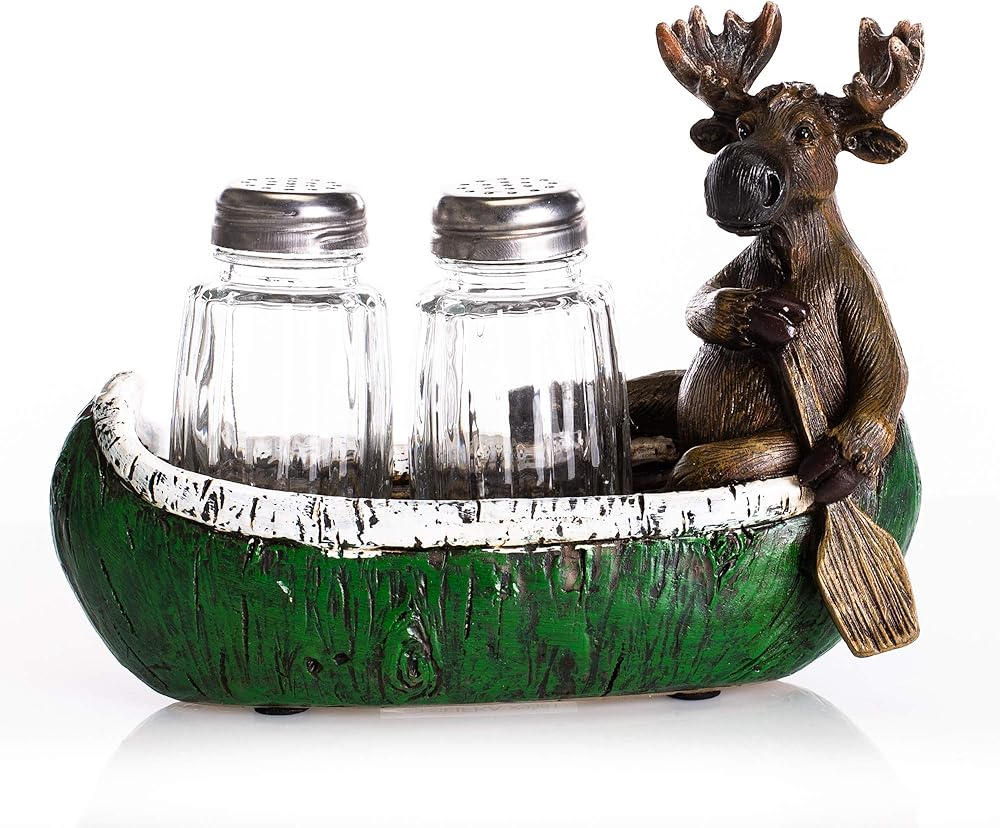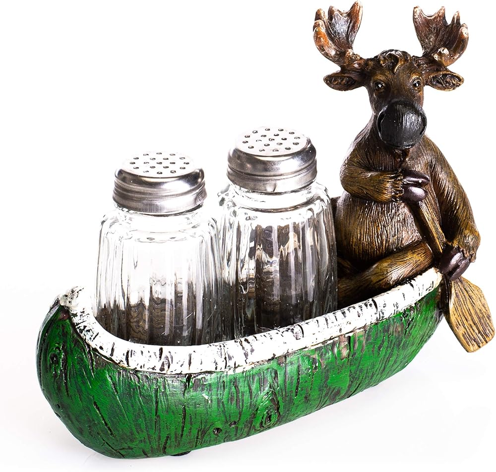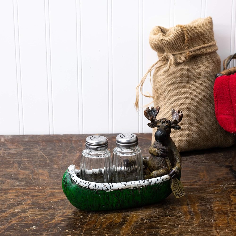 Moose and Canoe Salt and Pepper Set features a hand painted moose in a canoe holding two shakers