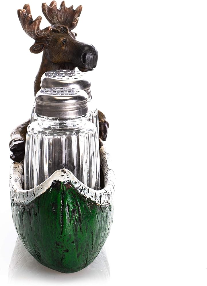 Slifka Sales Company is an importer and wholesale distributor of quality Wildlife, Up-North, Seasonal and Lodge style Giftware. Moose and Canoe Salt and Pepper Set features a hand painted moose in a canoe holding two shakers. Shakers are made of glass with resin stone holder with rustic green finish. Salt and pepper shaker set measures approximately 6 x 5 x 2.5 inches. Perfect for functional use or decorative display in the kitchen. Ships in protective packaging.