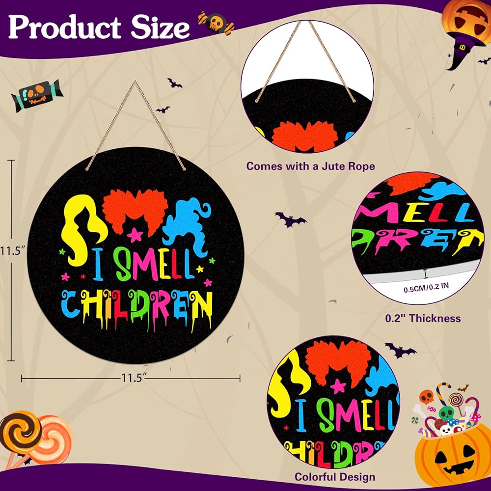 • 【علامة ديكور هوكوس بوكوس للهالوين】: لافتة باب الهالوين مطبوعة بكلمات "I رائحة الأطفال" وأنماط "Sanderson Sisters"، علامة I رائحة الأطفال مناسبة لديكورات حفلات الهالوين، مما يخلق جوًا مخيفًا ومثيرًا للاهتمام للاحتفال بعيد الهالوين.
