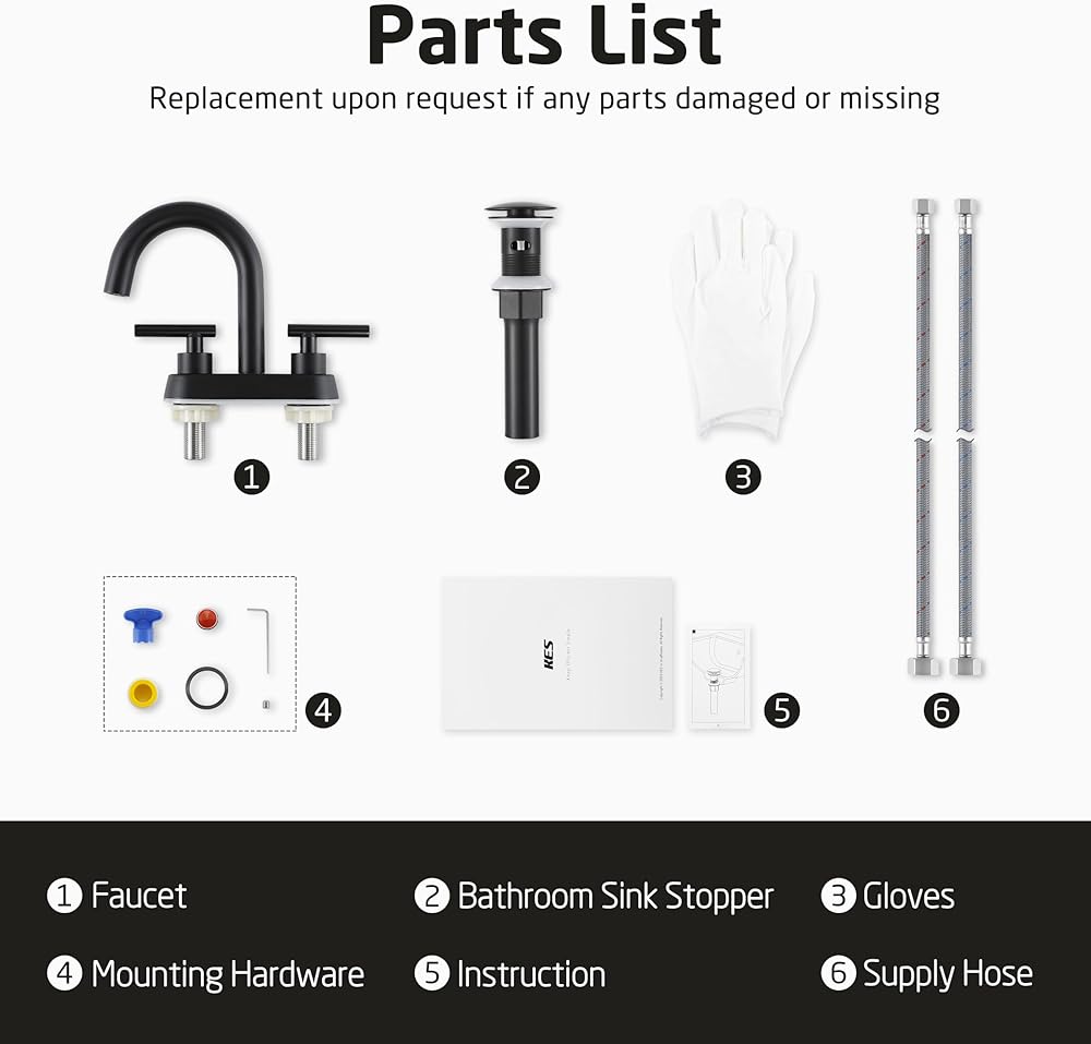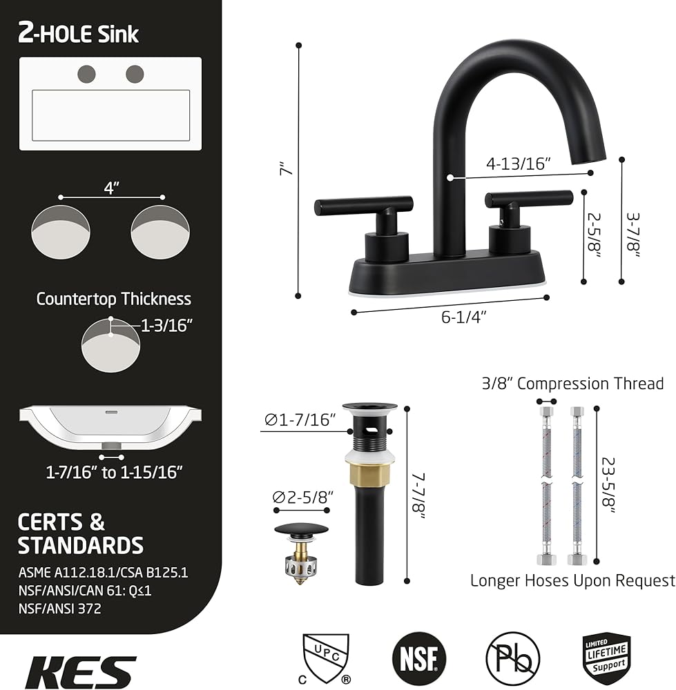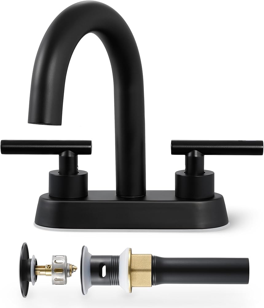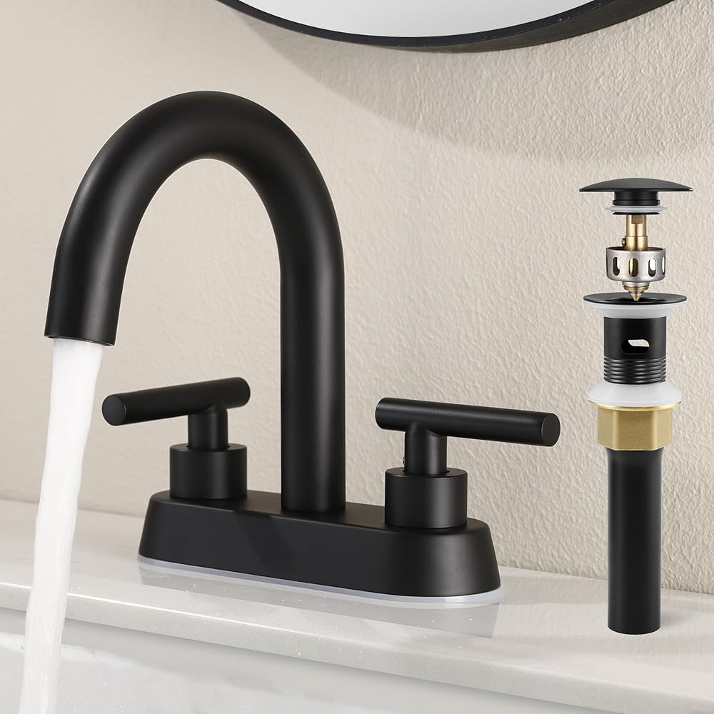 صنبور حمام KES مع تصريف، 4 بوصات مركزية 1.2 GPM مع تصريف منبثق من الفولاذ المقاوم للصدأ مع تدفق زائد، صنبور حمام بمقبضين cUPC صنبور فانيتي حديث أسود غير لامع، L4117LFF12-BK-C2