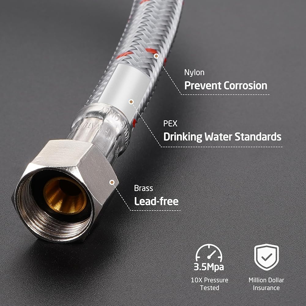 خراطيم الإمداد الممتازة: تأتي الخراطيم بطبقة خارجية من النايلون المضفر الذي يحمي من التآكل الكيميائي (الذي يحدث عادةً بسبب المنظفات) والصدأ. الأنابيب الداخلية مصنوعة من مادة PEX الآمنة لمياه الشرب. مع موصلات خيط الضغط القياسية مقاس 3/8 بوصة (بالطبع، مصنوعة من النحاس الخالي من الرصاص، ومياه الشرب آمنة مرة أخرى!) ، يمكنك بسهولة توصيل خراطيمنا بصمامات التوقف الخاصة بك. تتمتع خراطيم الإمداد لدينا بتغطية تأمينية عالمية بمليون دولار.