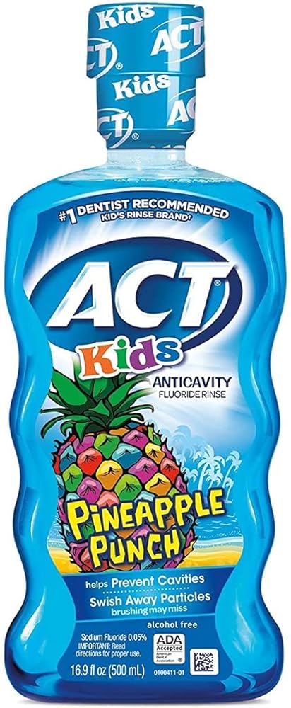 The ACT Kids Anticavity Fluoride Rinse Kit includes two delicious flavors—Pineapple Punch and Bubble Gum Blowout—that make oral care fun and effective for kids. This fluoride rinse helps prevent cavities by strengthening tooth enamel and swishing away particles that brushing may miss. Alcohol-free and formulated with 0.05% sodium fluoride, it's gentle on young mouths while providing maximum cavity protection. Perfect for a daily oral care routine, this kit ensures your child's smile stays healthy and bright.