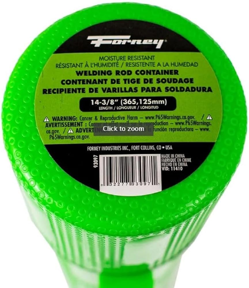 The Forney 93097 deluxe welding rod storage container is made of high impact red polypropylene plastic. It has four (4) internal compartments to separate rod. It features a screw-type cap and rubber O-ring to provide clean, dry, air-tight storage for electrodes. Forney Industries is one of Americas longest operating family-owned metal working product companies. Founded in 1932, Forney offers more than 5,000 products for the hardware, automotive, farm and ranch and do-it-yourself markets.If you've got metal working questions, we've got answers. Were committed to your success regardless of location size or needs. This container is 14-3/8" (365.13mm) overall in length (OAL) and stores up to 10 Lbs. (4.54 Kg) of rods. Claims for warranty must be made within 90 days of the date of purchase. Proof of purchase required. This warranty does not cover any product that has been subject to misuse, neglect, negligence or accident, or that has been used in any way contrary to the purpose intended.