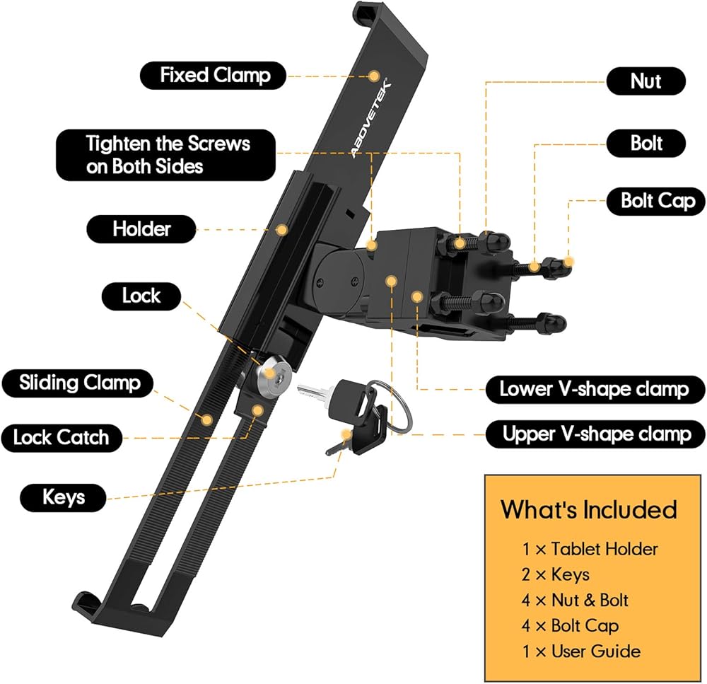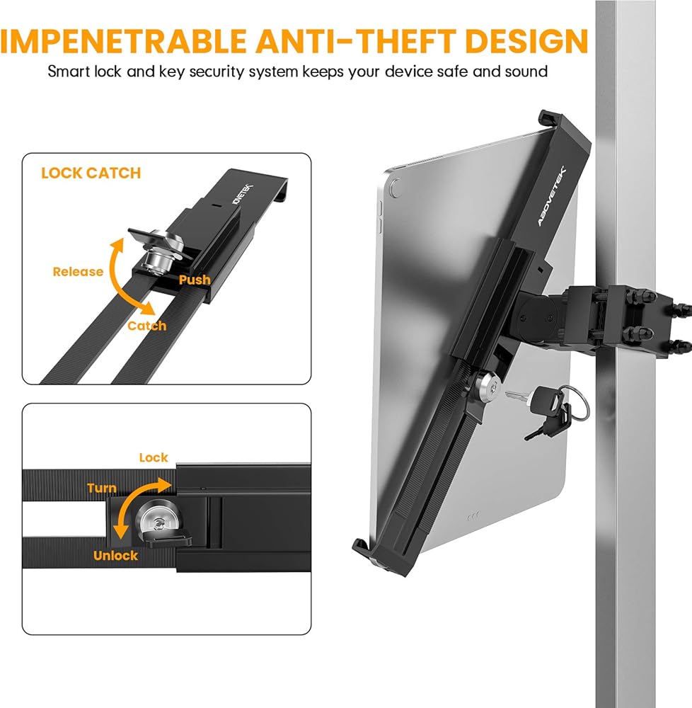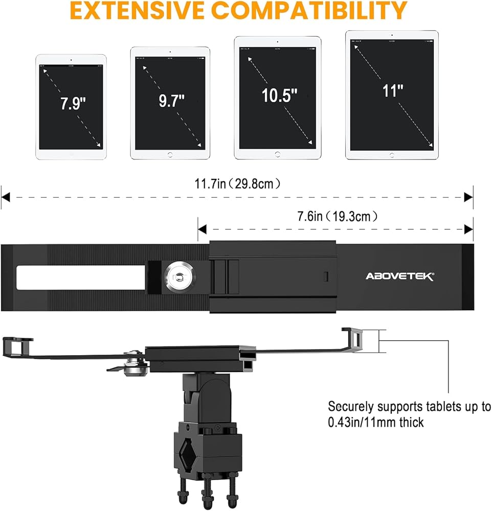 Robust Anti-Theft Security: Featuring a durable anti-theft lock and key system, the AboveTEK Golf Cart iPad Mount offers reliable protection against theft and tampering. Its robust design ensures seamless attachment to various fixtures such as handlebars and mic stands, making it ideal for high-traffic and customer-facing locations.