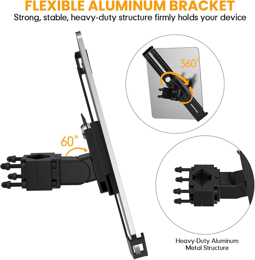 Universal Compatibility: The AboveTEK Golf Cart Tablet Holder boasts universal compatibility, easily adjusting to fit tablets from 6.9" to 11.2", including iPad, iPad Pro, iPad Mini, Microsoft Surface, Samsung Galaxy Tab, Google Pixel Slate, and Amazon Fire. It's perfect for hands-free access to apps and media in diverse settings, from outdoor leisure to professional environments.