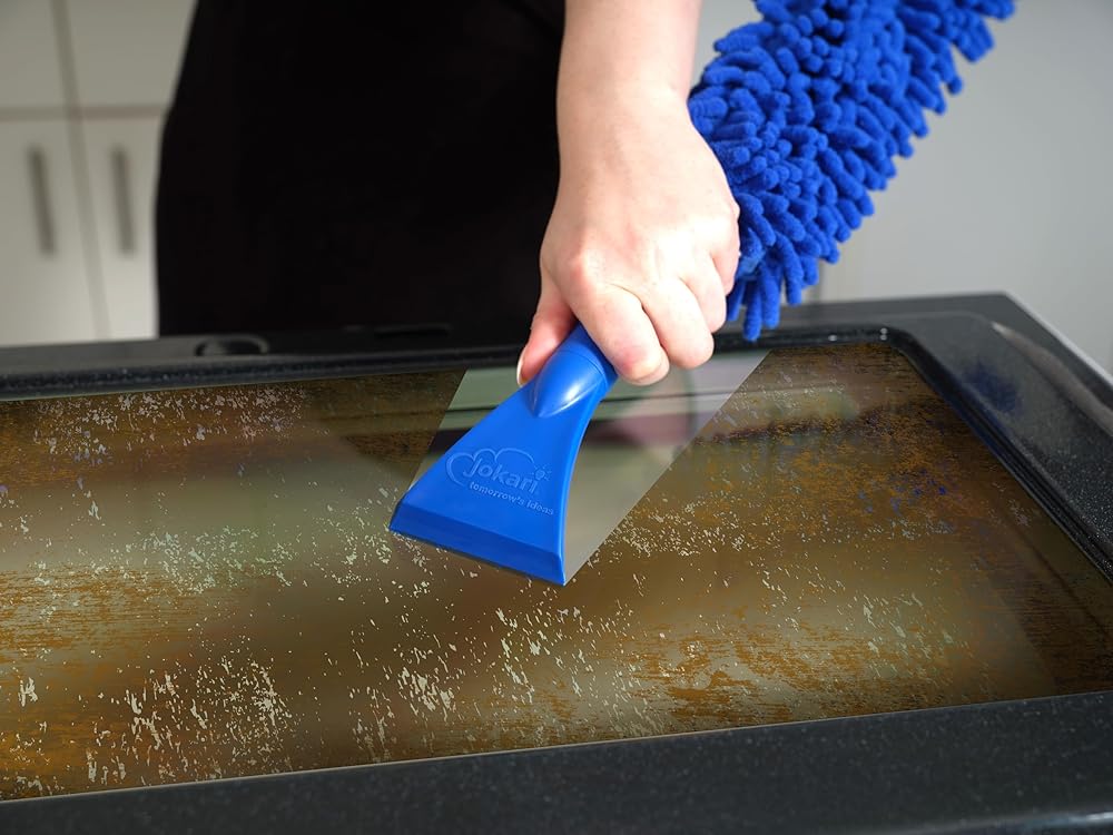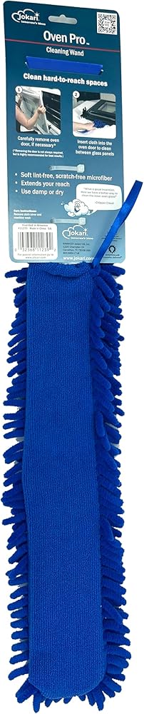 عصا تنظيف باب الفرن مزدوجة الجوانب مقاس 17 بوصة من جوكاري مع منظف من الألياف الدقيقة ومكشطة صلبة. سهل التنظيف بين الألواح الزجاجية - مثالي للتنظيف العميق، وقد يتطلب إزالة الباب