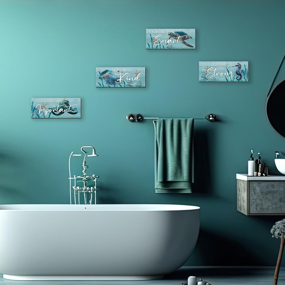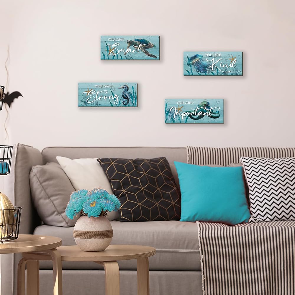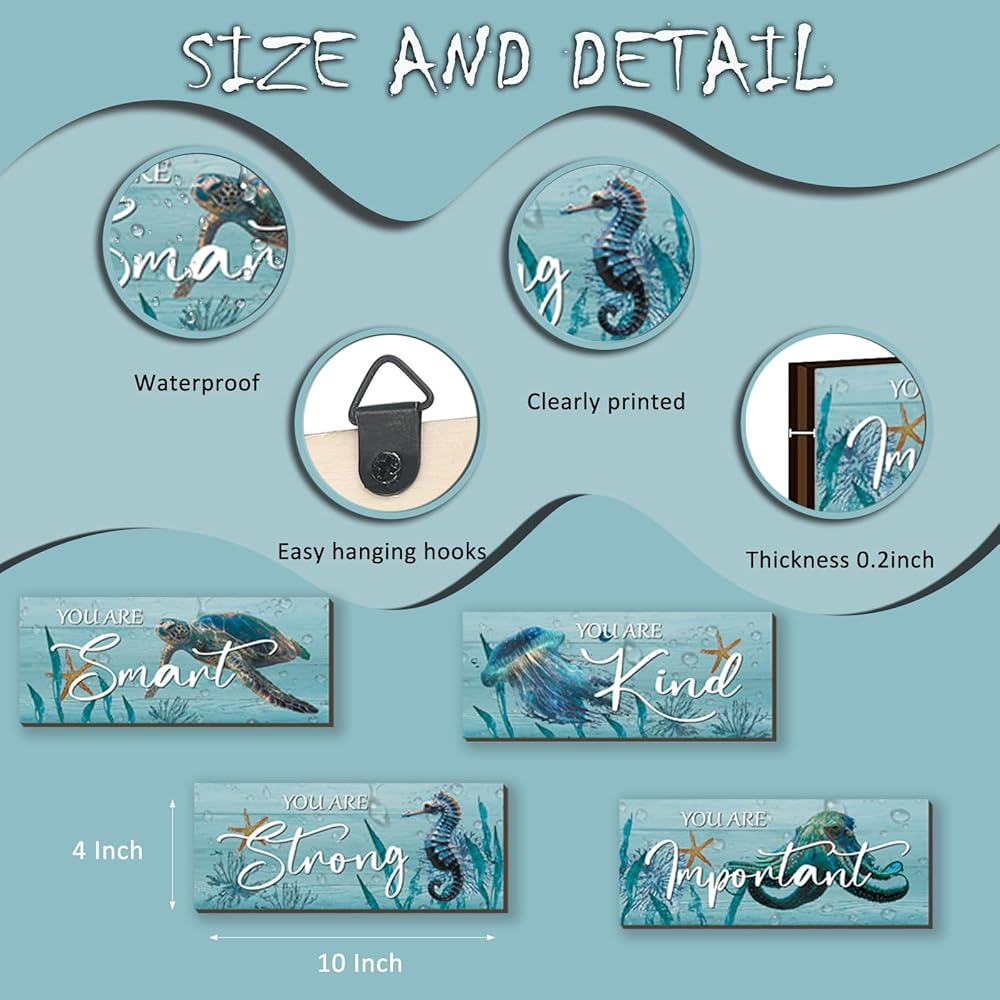 FENCORDAR 4 قطع ديكور حمام المحيط للأولاد غرفة ديكور جدار المحيط ملهمة علامة جدار خشبية ديكور جدار السلاحف البحرية للبنين غرفة الأطفال الحضانة غرفة نوم هدايا عيد الميلاد (المحيط 10X4)