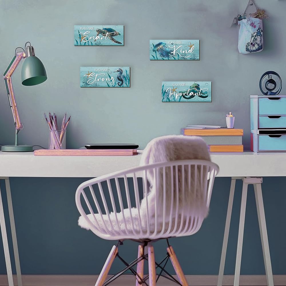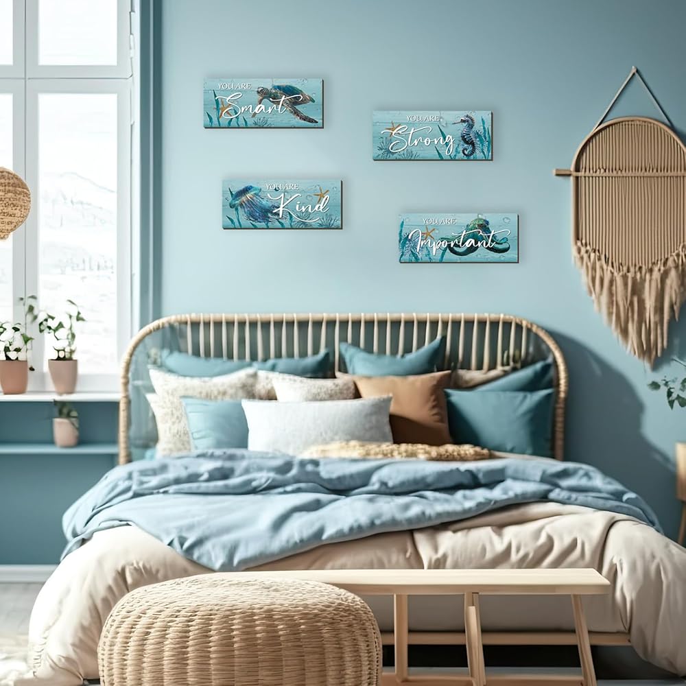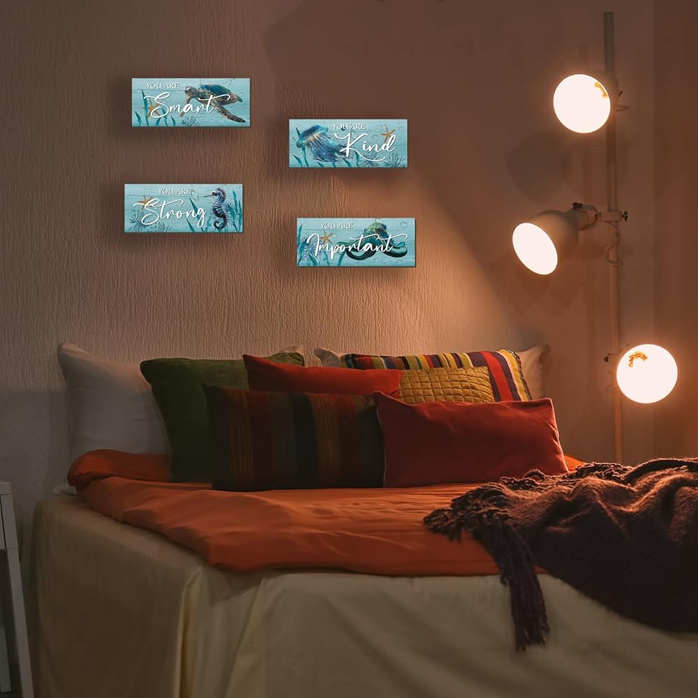 مجموعة مكونة من 4 قطع لموضوع المحيط: تتضمن هذه العبوة 4 ديكورات بطابع المحيط، كل منها يتميز بتصميم بطابع المحيط مع اقتباسات ملهمة، مع خطافات مجهزة في الخلف، مما يحول غرفة طفلك إلى عالم مليء بالمحيط، إنها طريقة ممتعة للحصول على الخيال يرتفع ويضيف لمسة من المرح إلى ديكور غرفتهم