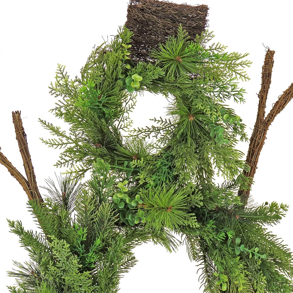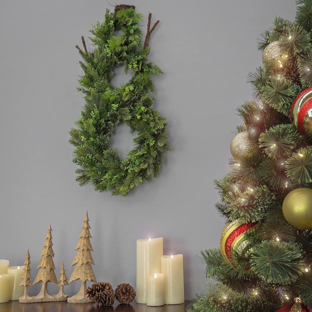 This unique holiday trimming will add a touch of whimsical charm to your Christmas decorating scheme. Three wreath sections featuring a mixture of evergreen, bristle and cedar branch tips flowing from thick woven branch rings combine to create the shape of a snowman. Two branch arms and a top hat add the appropriate and finishing touches to the design. For indoor display on door, wall, or window. This fantastically festive artificial wreath features three wreaths put together to form a snowman. Suitable as an indoor or covered outdoor decoration, display this festive artificial wreath by hanging this wreath on any doorway or fireplace mantle. Crafted with sturdy, high quality materials, this holiday themed artificial wreath is designed to capture the charm and colors of the winter season year after year. Celebrate the season with the inviting and stylish HGTV Home Collection. Holiday memories are made at home. The HGTV Home Collection will make them beautiful. Includes one green colored artificial wreath measuring 28"x6"x44".