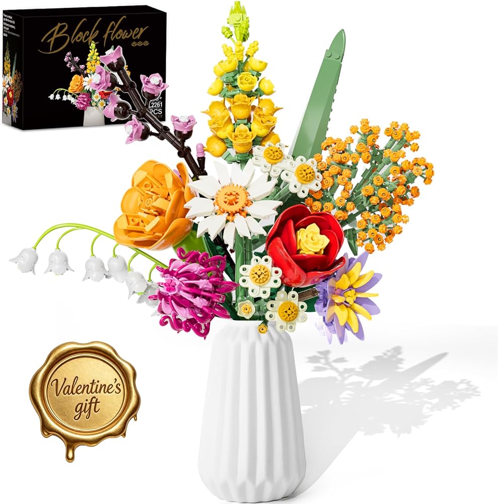 مجموعة بناء باقة الزهور، 1070 قطعة من لعبة مجموعة الزهور النباتية الاصطناعية للبالغين والأطفال والنساء، مجموعة نباتات الزهور البرية، هدية ديكور المنزل لأعياد الميلاد والكريسماس وعيد الحب (بدون مزهرية)