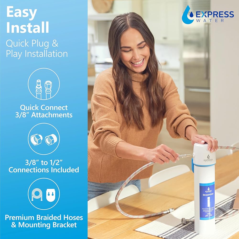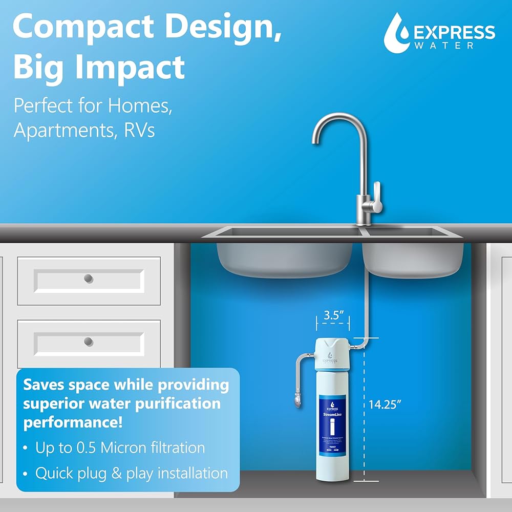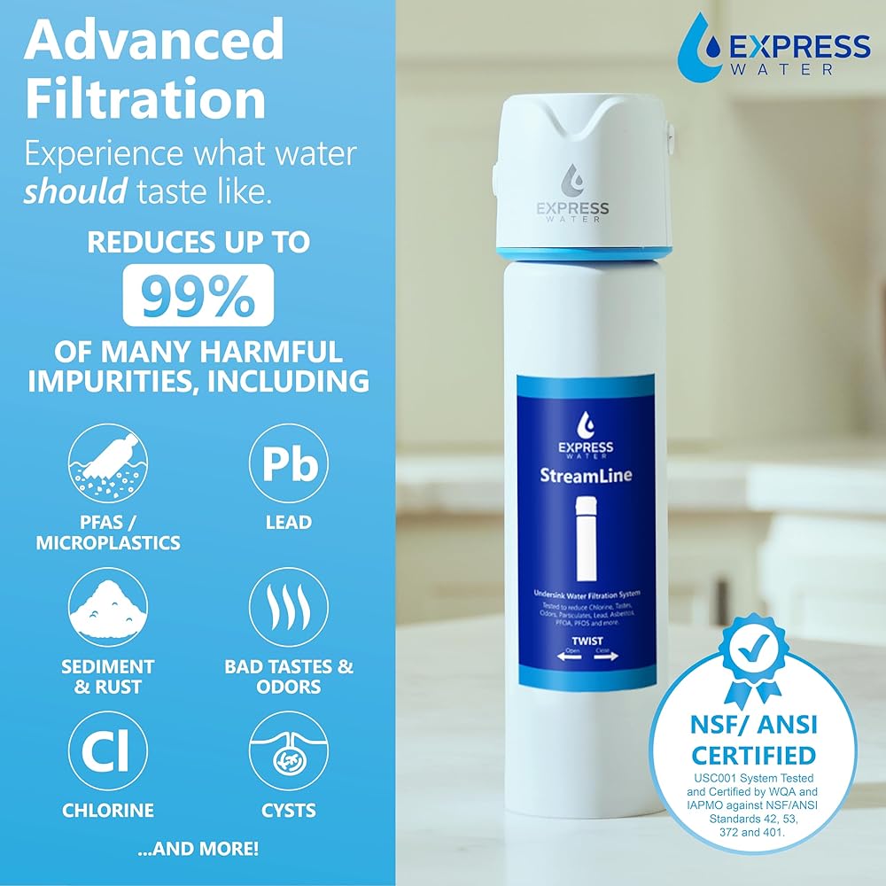 نظام فلتر مياه Express Water StreamLine USC001 تحت الحوض، يقلل من PFAS، PFOA/PFOS، الرصاص، الكلور، فلتر مياه تحت العداد يتصل مباشرة بصنبور المطبخ NSF/ANSI 42، 53، 372، 401 معتمد