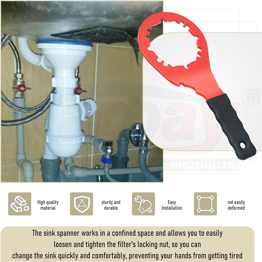 The sink spanner works in a confined space and allows you to easily loosen and tighten the filter's locking nut, so you can change the sink quickly and comfortably, preventing your hands from getting tired.
