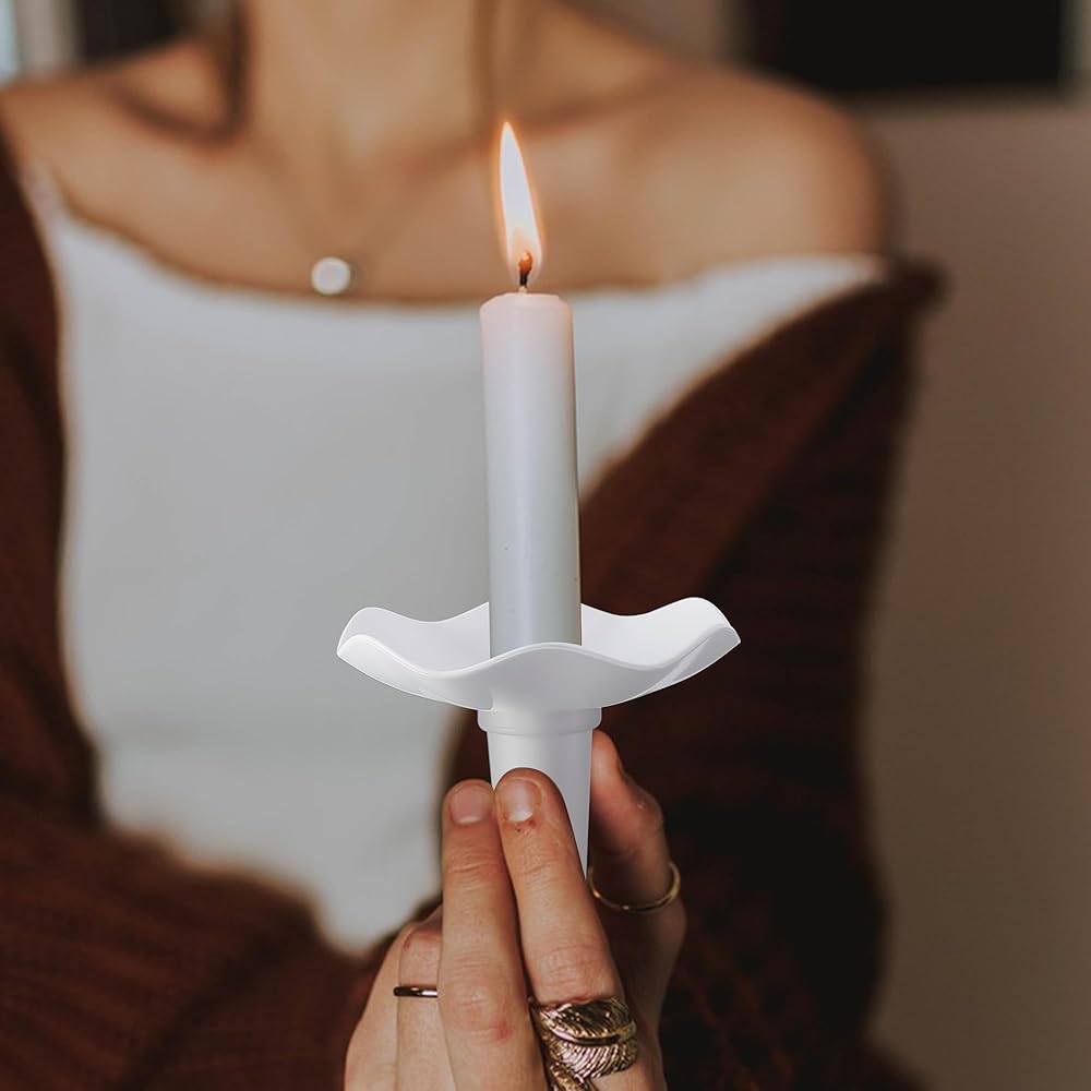 Practical design:The handheld candle holders consists of candle holders and wax catchers. The hollow 0.7 inch round design makes it easy to hold the candle in place. The 3-inch diameter petal shaped wax holder effectively catches and holds melted wax with smooth, flat edges that won't hurt your hands.