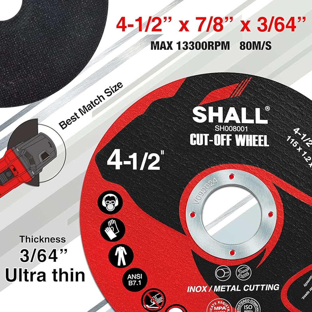 💿 [حجم عالمي] - عجلة القطع 4 1/2 × 7/8 بوصة متوافقة تمامًا مع جميع المطاحن الزاوية 4-1/2 بوصة (115 مم) مع أربور 7/8 بوصة (22.2 مم). السُمك: 3/64 بوصة (1.2 مم). تعمل حتى 13,300 دورة في الدقيقة 80 متر/الثانية.