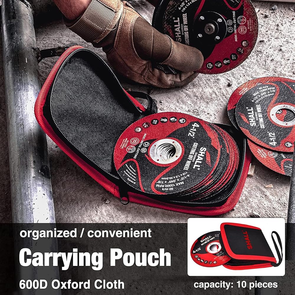 💿 [حقيبة حمل إضافية] - إلى جانب 25 عبوة من العجلات المقطوعة مقاس 11.43 سم، تأتي أيضًا مع حقيبة حمل متينة مصنوعة من قماش أكسفورد 600D لحمل عجلة مقطوعة مقاس 4.5 سم للمعادن. يمكن تحميل ما يصل إلى 10 قطع في المرة الواحدة لجعل عملك أكثر تنظيمًا ولحماية عجلات القطع من الرطوبة والأوساخ، مع الحفاظ على أداء أقراص القطع.