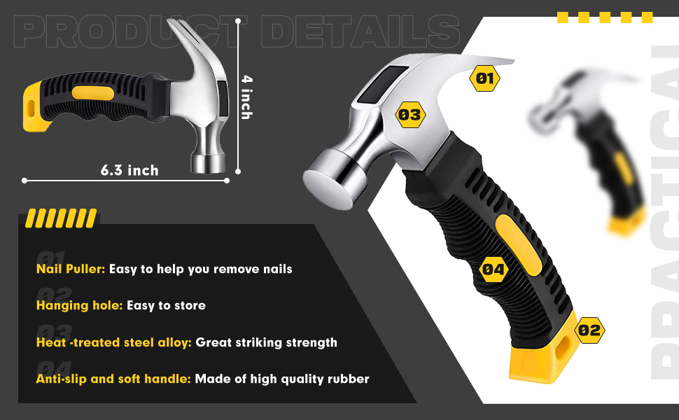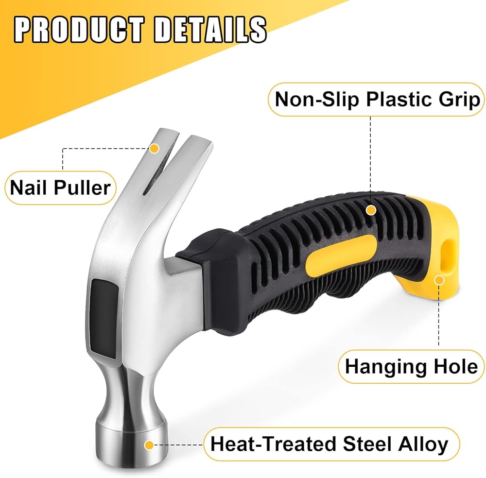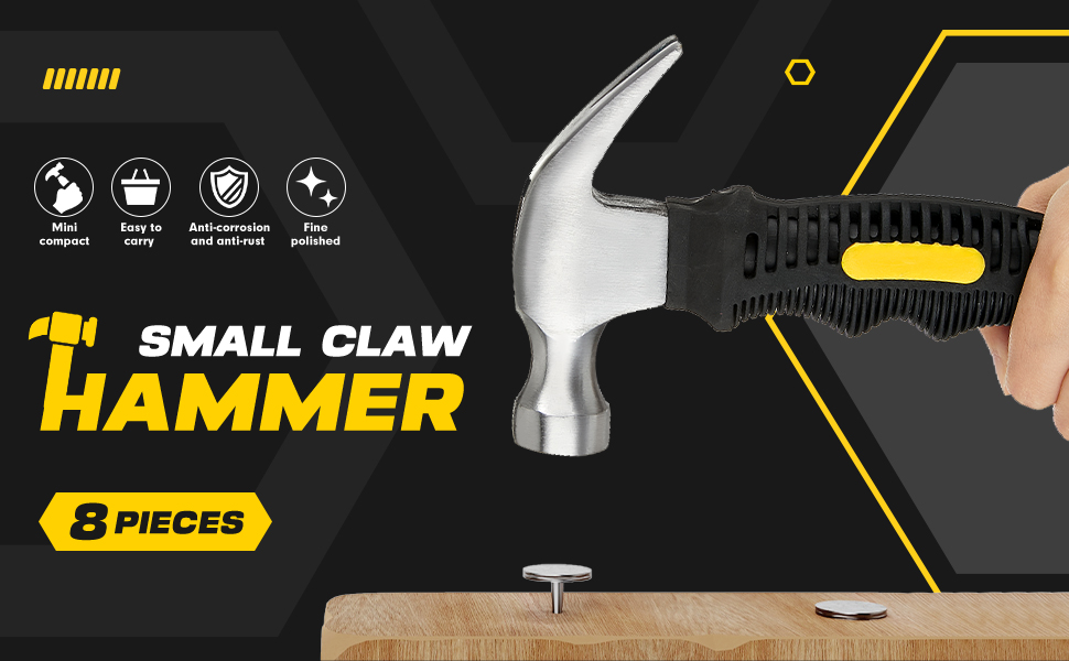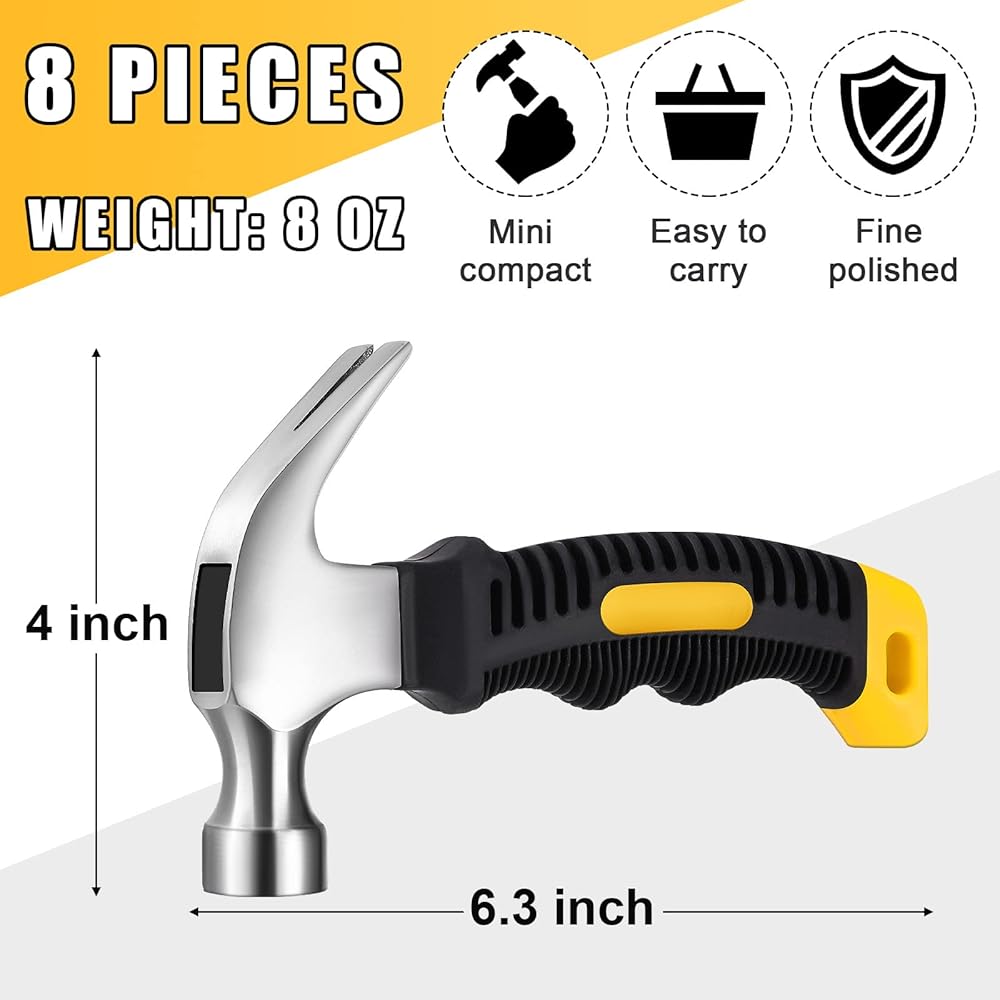 صغيرة وخفيفة الوزن: ستحصل على 8 قطع من مطارق الأظافر، الطول الكامل حوالي 6.3 سم، وزن رأس المطرقة حوالي 8 أونصة وحجم 4 بوصات، وهو مناسب للمساحات الصغيرة أو المحدودة.