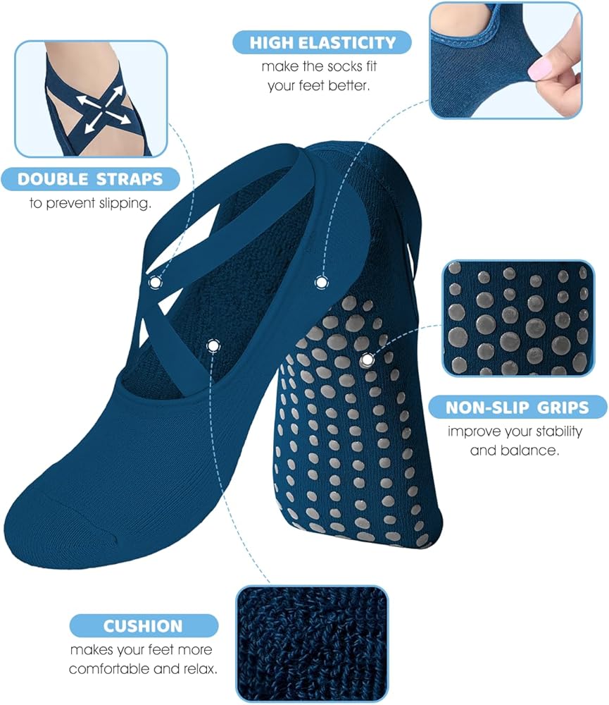 • تصميم فريد - تتميز الجوارب ذات المقبض بتصميم فريد من نوعه على طراز الباليه مع شريطين عريضين متقاطعين لجعل القوس مريحًا وملائمًا لبشرتك مثل حافي القدمين وتساعد على تثبيت جوارب اليوغا في مكانها بشكل آمن ومنعها من الانزلاق عن قدميك. تتميز هذه الجوارب الجذابة بأشرطة مرنة لإضافة الأناقة إلى تمرينك