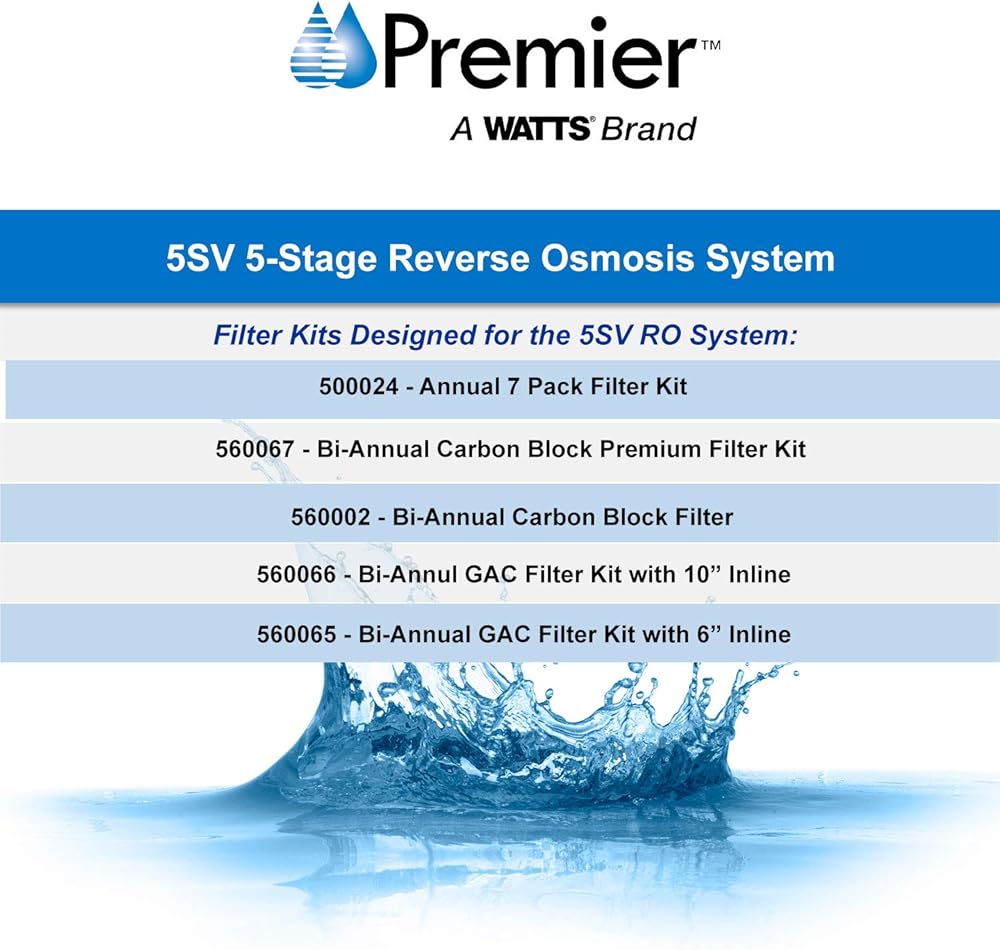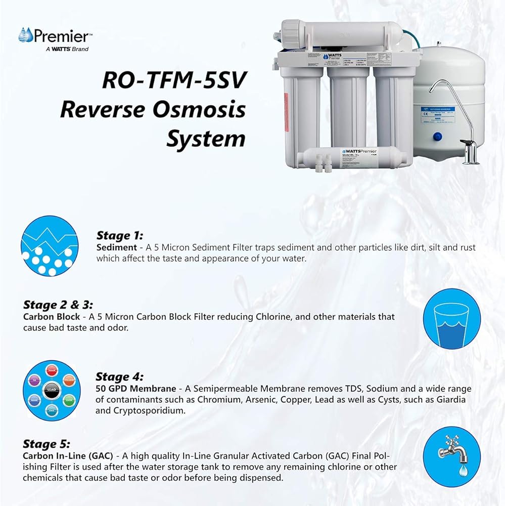 Say goodbye to unpleasant tastes and odors with the Watts Premier 5SV 5 Stage Reverse Osmosis System. It was one of the first systems on the market - that still provides great quality drinking water today. This system includes a Reverse Osmosis module, five filters, a chrome air gap faucet, and a 3-gallon storage tank.