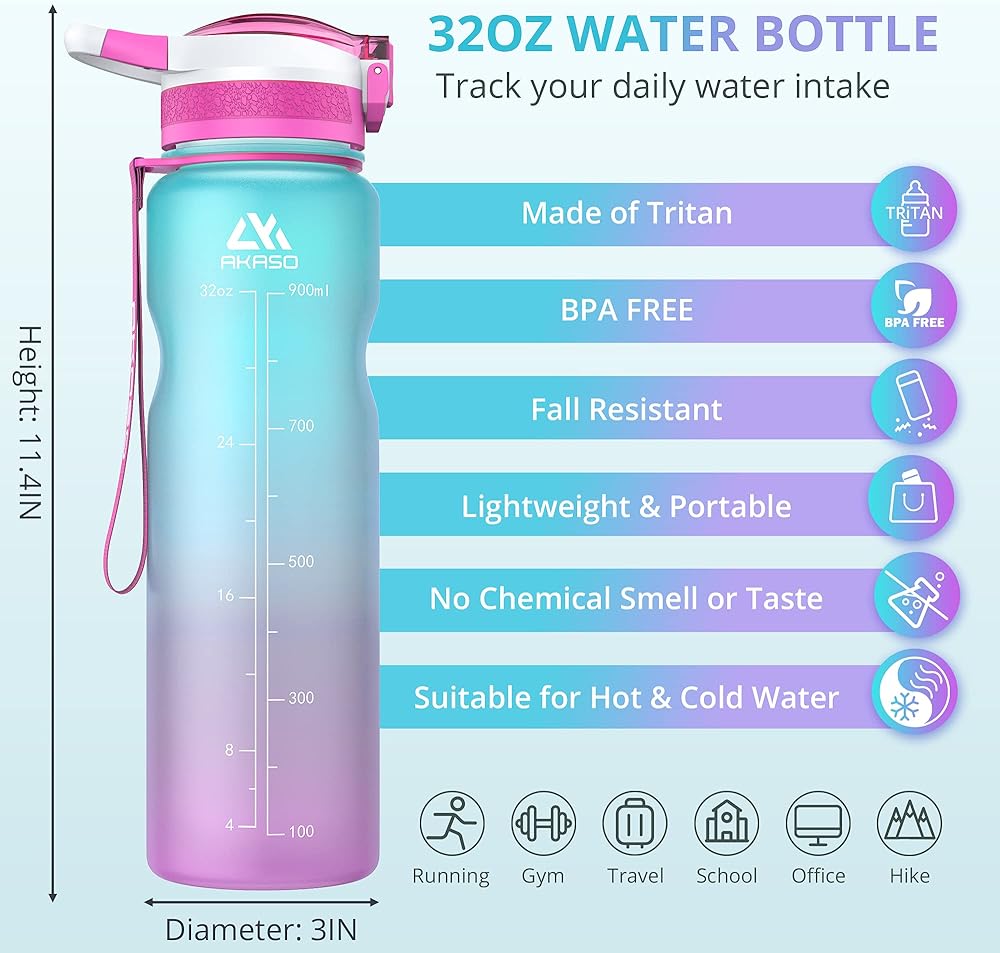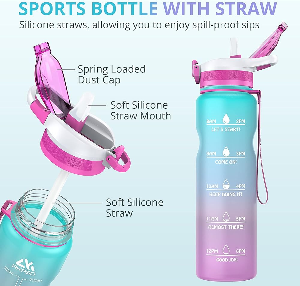 زجاجات مياه AKASO سعة 32 أونصة مع قلم تحديد الوقت التحفيزي وقش، مانعة للتسرب، قفل أمان، تريتان خالية من البيسفينول A، إبريق ماء للياقة البدنية والمكتب الرياضي
