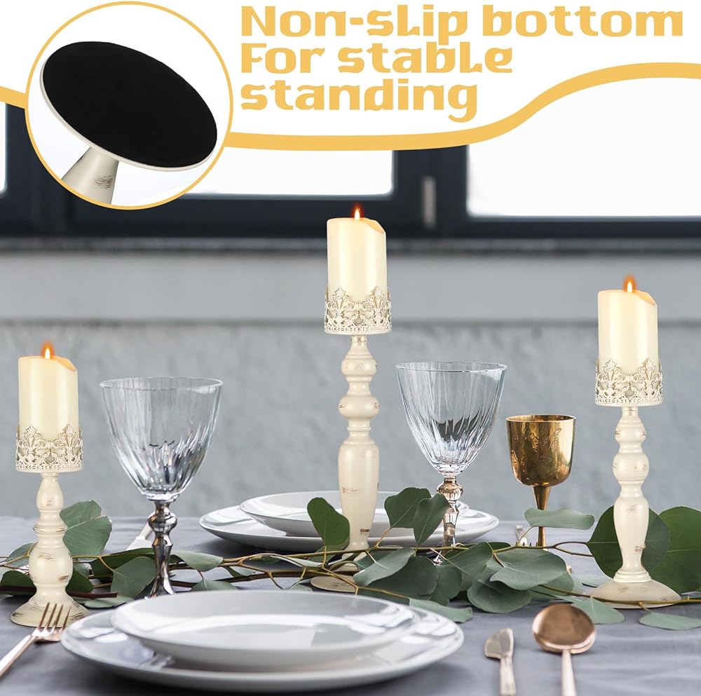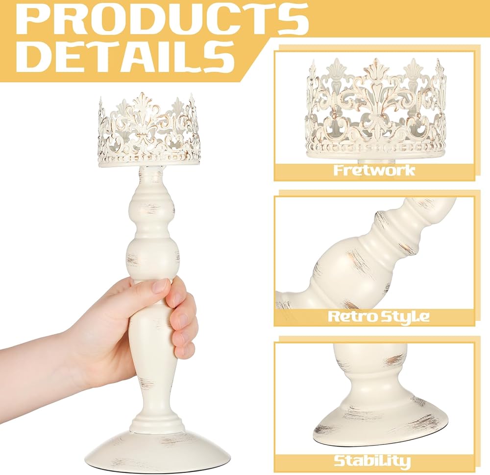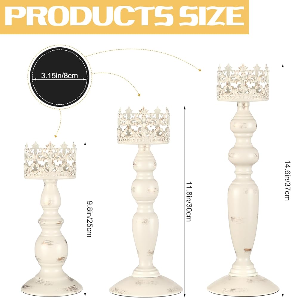 • Metal Candle Holders: you will receive 3 pcs metal candle holders in beige white old farmhouse style, available in large, medium and small sizes; The base diameter of the large and medium candle holders is about 4.7 inches/ 12 cm, and the height is about 14.6 inches/ 37 cm and 11.8 inches/ 30 cm respectively; The base diameter of the small candle holder is about 3.9 inches/ 10 cm, and the height is about 9.8 inches/ 25 cm