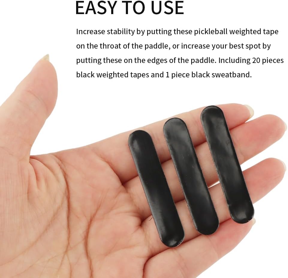 • 【EASY TO USE】Increase stability by putting these pickleball weighted tape on the throat of the paddle, or increase your best spot by putting these on the edges of the paddle. Including 20 pieces black weighted tapes and 1 piece black sweatband.