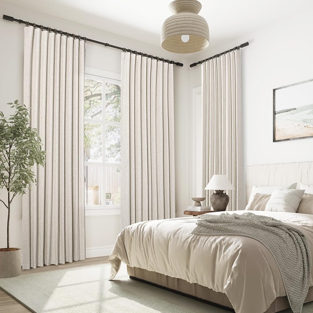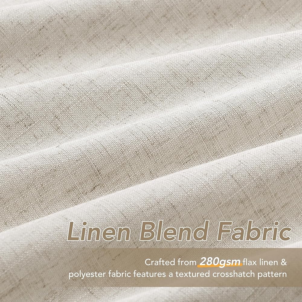 نسيج مزيج من الكتان: هذه الستائر المعتمة من الكتان مصنوعة من نسيج مزيج الكتان بنسبة 30% ومضاف إليها طلاء معتم بنسبة 100% على الظهر. الستائر السوداء ليست سميكة فقط، ولكنها أيضًا ذات ملمس وستائر. يحتوي نسيج سلوب على بقع كتانية مرئية للحصول على مظهر طبيعي وملمس وجمالي.