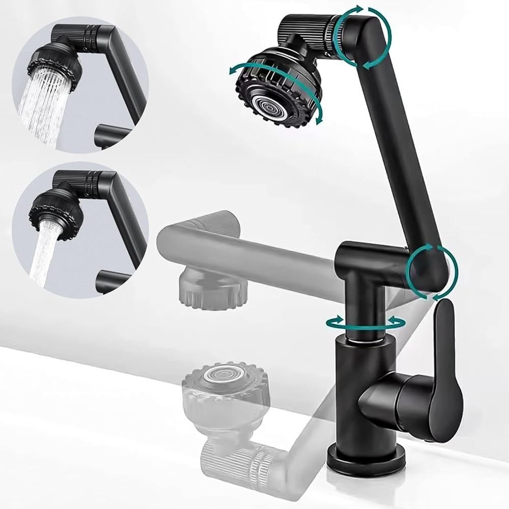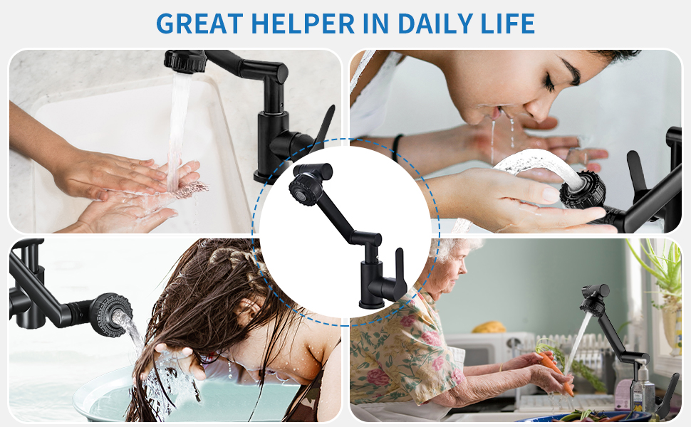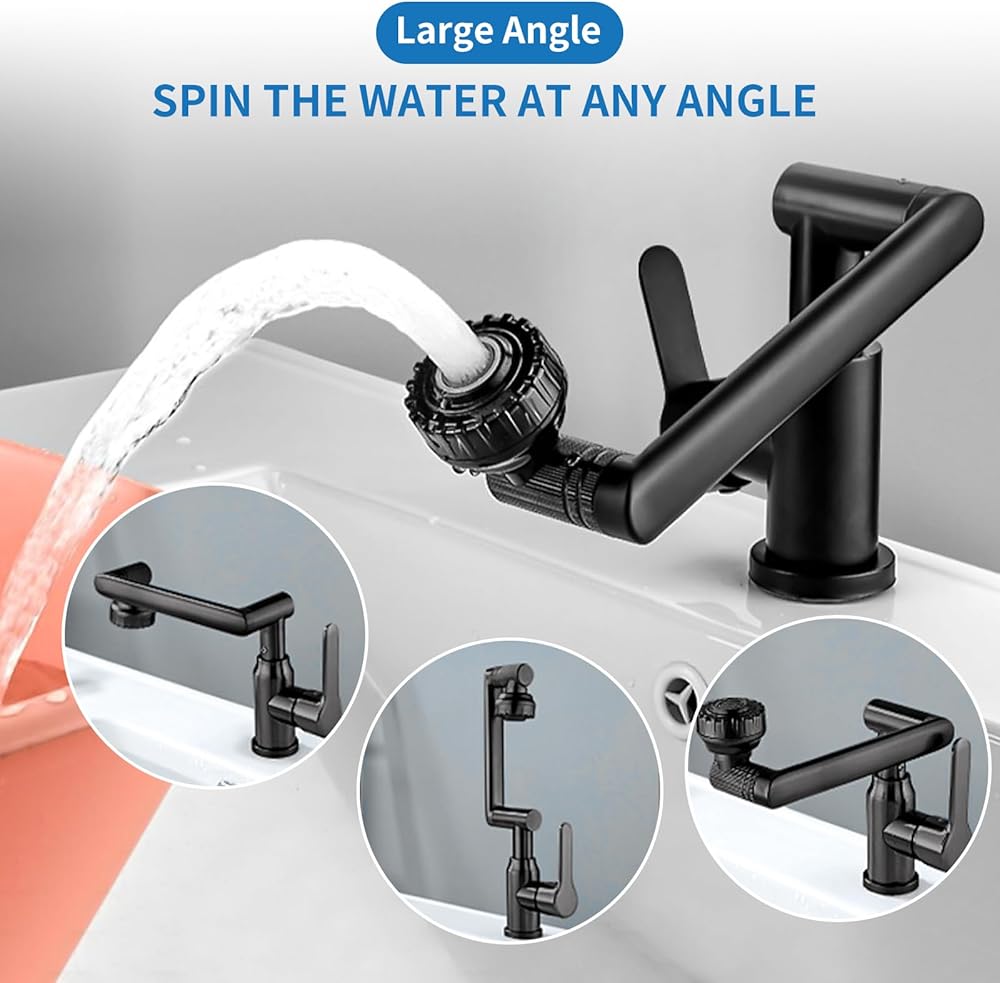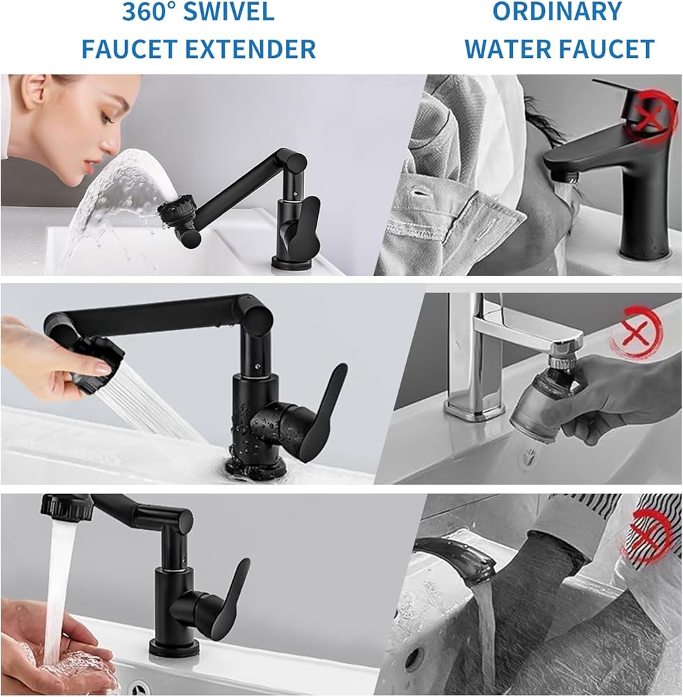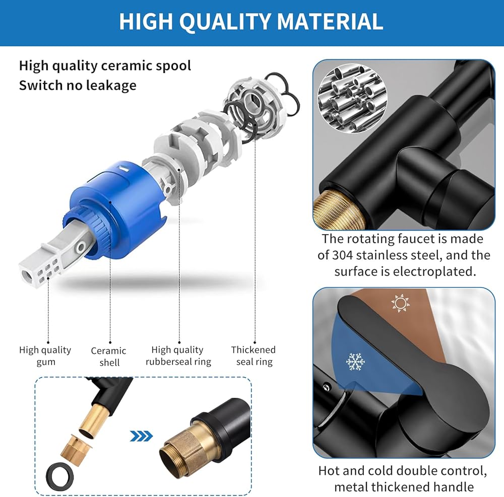 【دوران 1080 درجة】: صنبور أسود بفتحة واحدة يدور 1080 درجة، باستخدام تصميم دوران ثلاثي المراحل، زاوية الدوران أكبر من صنبور دوران 360 درجة، ويمكن ثنيها أو طيها بسهولة، حتى يصل الماء إلى كل ركن من أركان الحوض. . أثناء عملية التعديل، لا توجد رطوبة ولا هدر للمياه. صنبور حوض الحمام يدور 1080 درجة، يغسل الوجه والفم والشعر وحوض الغسيل أكثر ملاءمة.