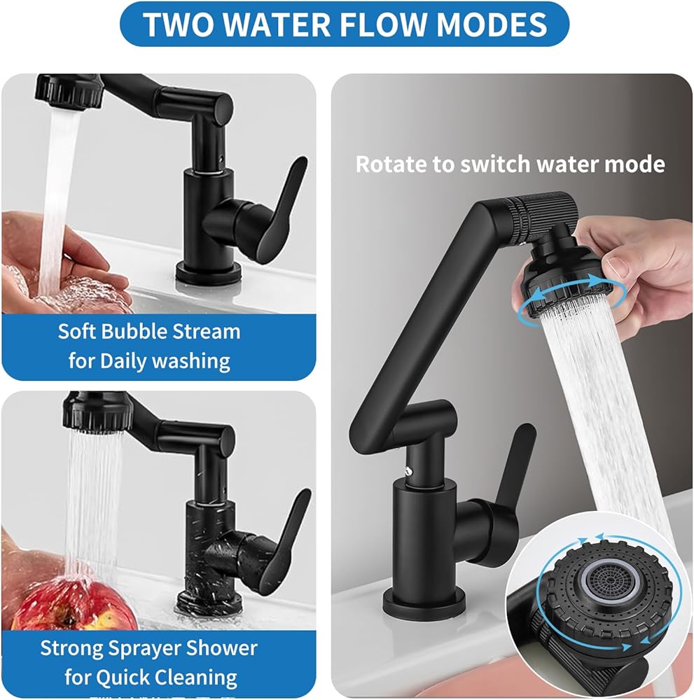 【وضع التدفق المزدوج】: رذاذ قوي + تدفق فقاعات ناعم. يوفر الدش الرأسي القوي تدفقًا قويًا وسريعًا للمياه ويعتبر مثاليًا لشطف البقع/الزيوت. وضع تدفق الفقاعات الناعمة مقاوم للرذاذ، وموفر للمياه، ورغوة غنية بالأكسجين، وأكثر لطفاً، ومناسبة لغسل اليدين وغسل الوجه. كل ما عليك فعله هو لف نهاية الصنبور لتبديل الأوضاع.