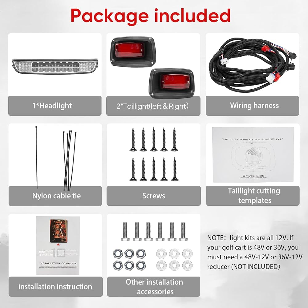[سهلة التركيب] - تشتمل مجموعة مصابيح EZGO TXT الخاصة بنا على تعليمات مفصلة، مما يجعل التثبيت عملية مباشرة (وقت التثبيت المقدر حوالي 2-3 ساعات). ملحوظة: إذا كانت عربة الجولف الخاصة بك 48 فولت أو 36 فولت، فستحتاج إلى مخفض جهد منفصل 48 فولت-12 فولت أو 36 فولت-12 فولت (غير متضمن).