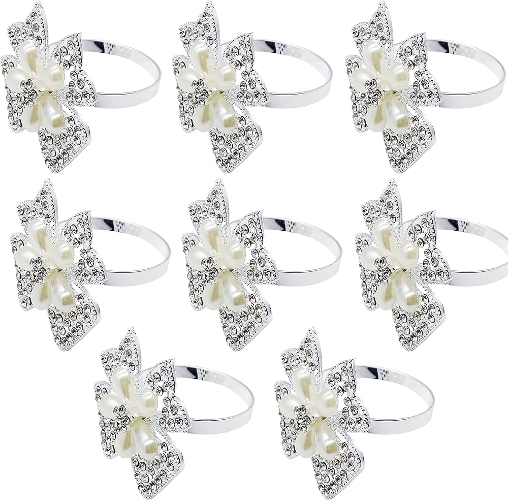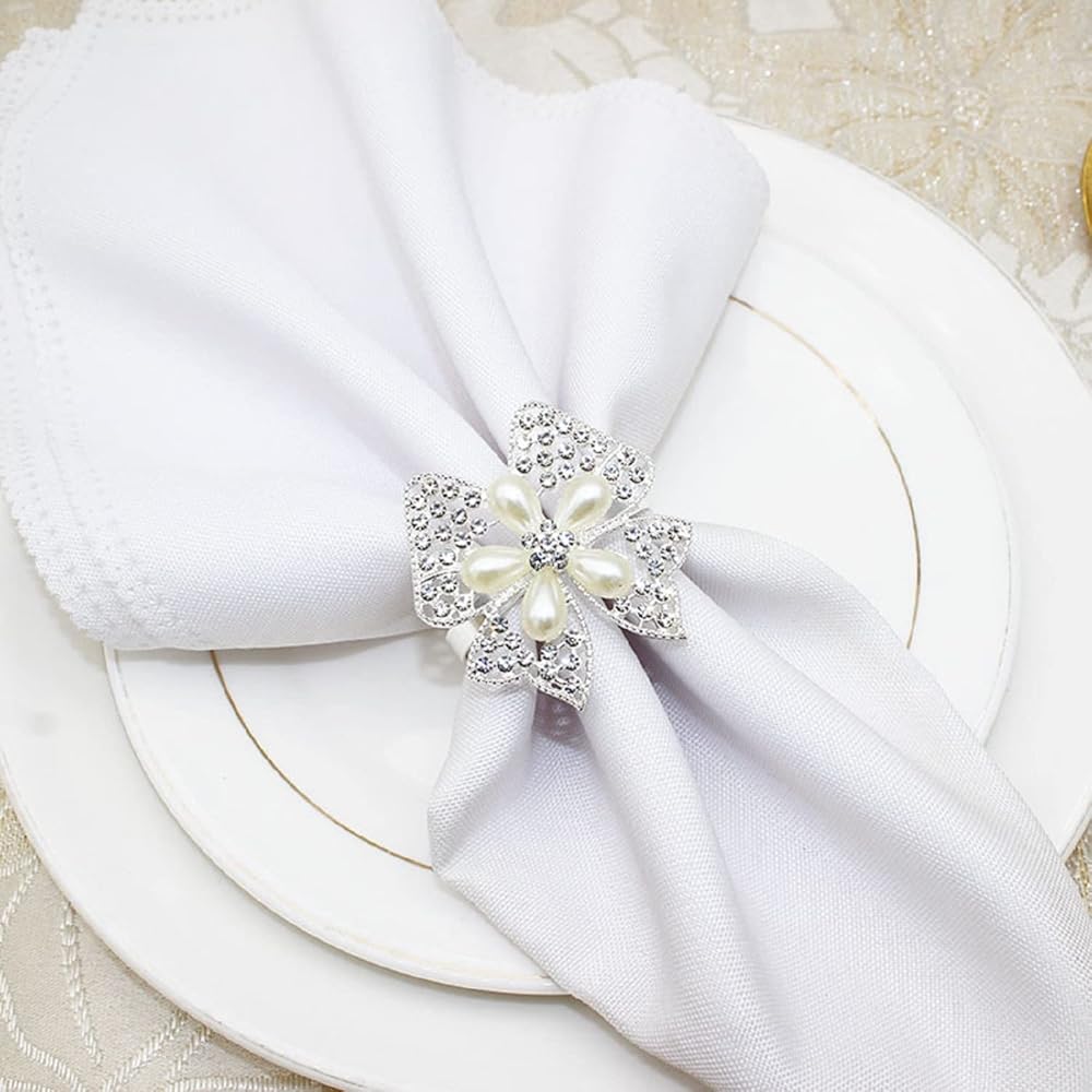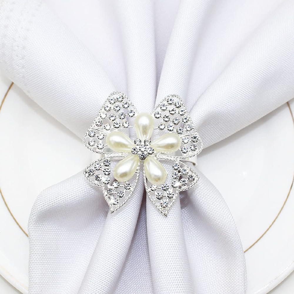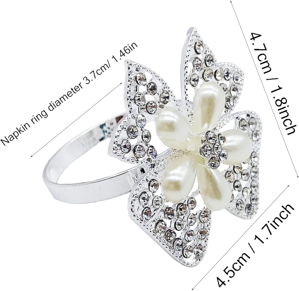 Material: Made of zinc alloy.imitation pearls and rhinestones dotted with ribbon.Durable, exquisite workmanship, smooth surface, no need to worry about hurting your table or napkin in daily use. You can use it over and over again, if it gets dirty wipe it off with a damp sponge or cloth, and then dry it with a soft dry cloth.