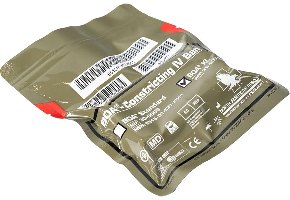 *** This Product Cannot Be Shipped Internationally Designed to accommodate a larger body type and fit a greater range of arm sizes. Stretches approximately 50% longer than the original BOA The NEW NAR (North American Rescue) BOA XL utilizes the same technology for quick and easy IV access on patients that might be uncomfortable wearing an original BOA. When tasked with improving peripheral IV access, North American Rescue engineers addressed both aspects of the challenge—how the product would work, and how easy it would be to work with. They met the challenge with the BOA XL Constricting Band, now a critical component of successful IV cannulation. How it works is revolutionary. Not since constricting bands were first conceived has the design been as fundamentally altered as it has been with the BOA XL. For improved central venous access every time, the BOA XL uses a rolling action to transfuse venous blood to the distal veins while still allowing arterial flow. (For maximum effect, the BOA XL is placed as high up on the extremity as allowable.) This technique distends the veins to make IV access quicker and more effective even in the most challenging patients. Its ease of application is also revolutionary. The BOA's patented design features a Quick Click connector and two-finger Quick Release for added efficiency. No longer do healthcare professionals need to tie (and often re-tie) a constricting band. The BOA XL decreases “time on task” for treating combat casualties, civilian trauma patients, or medical patients with poor vascular access (for example, diabetic wound care). Originally designed for our Armed Forces, the BOA XL is now available to all First Responders. Dimensions: Packaged: L 4 in. x W 3 in. x D 0.9 in. Device Length:10 in. expanding to 27 in. Weight: 1.5 oz Ships To U.S. Destinations Only