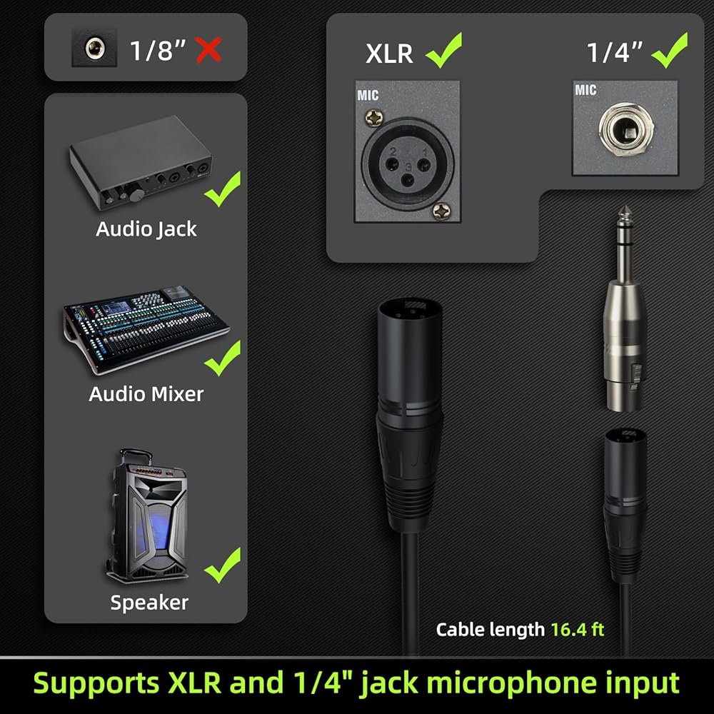 كابل ميكروفون - كابل ميكروفون XLR ذكر إلى أنثى بطول 16.4 قدم مع درع حلزوني نحاسي بالداخل لتقليل تداخل الضوضاء. مجهزة بمحول TRS أنثى XLR إلى 1/4 بوصة، متوافق مع المزيد من المعدات الصوتية.
