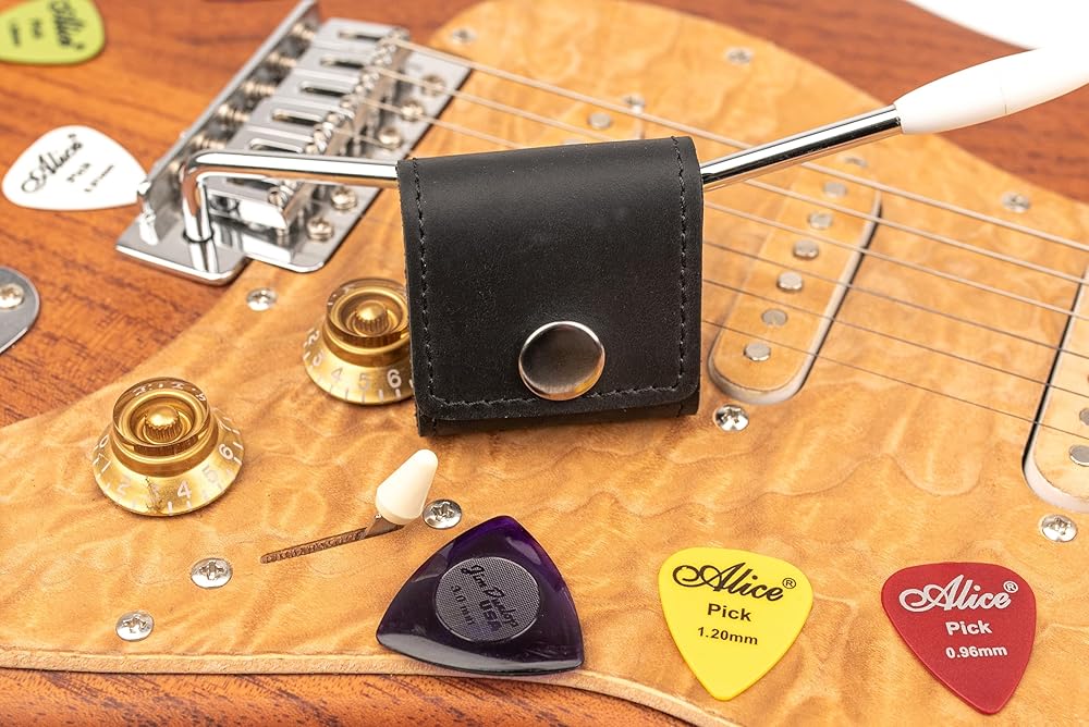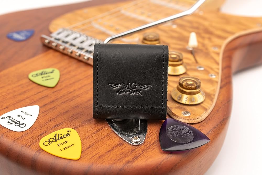 PREMIUM LEATHER MATERIAL: Made from genuine leather, ensuring durability and a stylish look while keeping your guitar picks safe and secure.