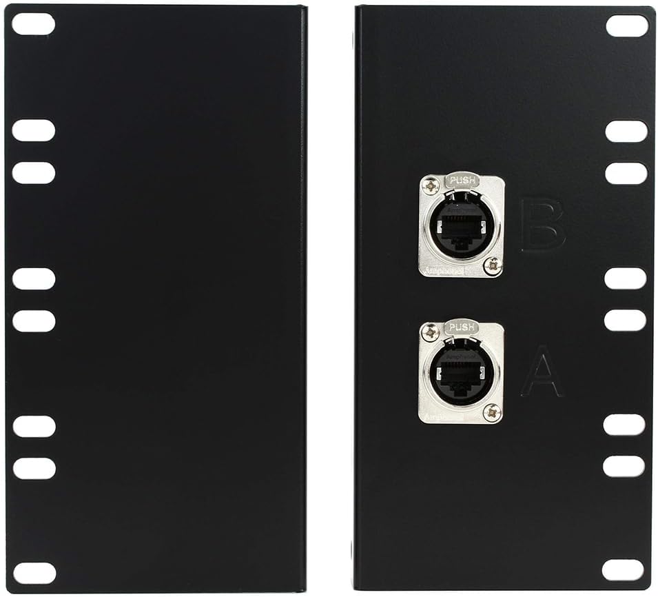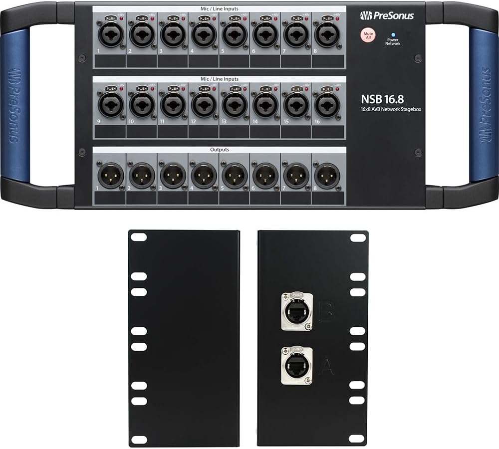 Designed to work seamlessly with PreSonus StudioLive Series III mixers, the PreSonus NSB 16.8 stage box offers 16 locking combo mic/line inputs with remote-controlled XMAX preamps that include gain compensation for shared input scenarios, as well as 16 direct inputs via AVB. All inputs can be controlled from a StudioLive Series III console and from free PreSonus UC Surface software. All eight outputs employ locking XLR jacks, while the built-in 2-port AVB switch lets you daisy-chain multiple units. The rugged steel chassis with sturdy handles is designed with a stage box form factor and allows the NSB 16.8 to sit well on the stage and survive the rigors of on-the-road wear and tear. The unit can be rackmounted with an optional rack-ear kit. Bundle with the PreSonus NSB 16.8 Rackmount Kit allows you to install your NSB 16.8 AVB network stagebox into a standard 19" rack mount enclosure. The kit includes two blank panels, two Ethernet cables, and mounting screws. One panel features two Ethercon jacks, which once connected with the included Ethernet cables, provides access to the AVB network ports from the front panel.