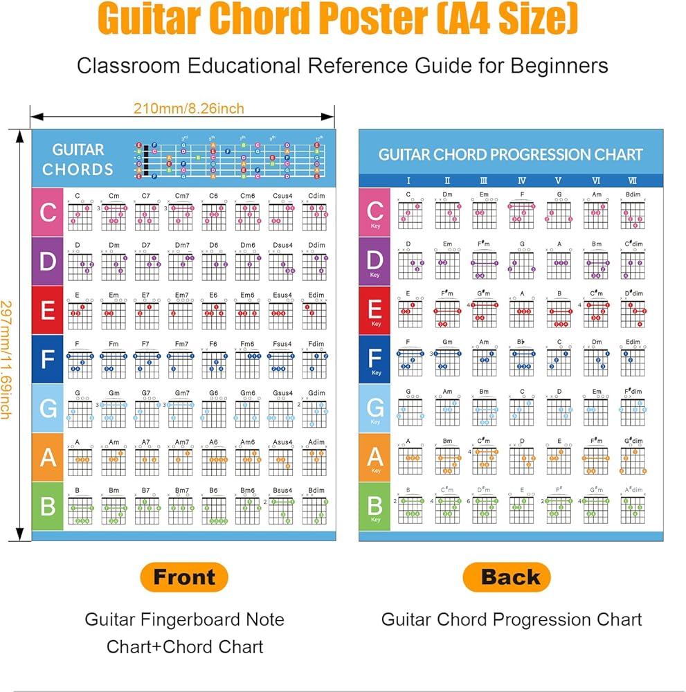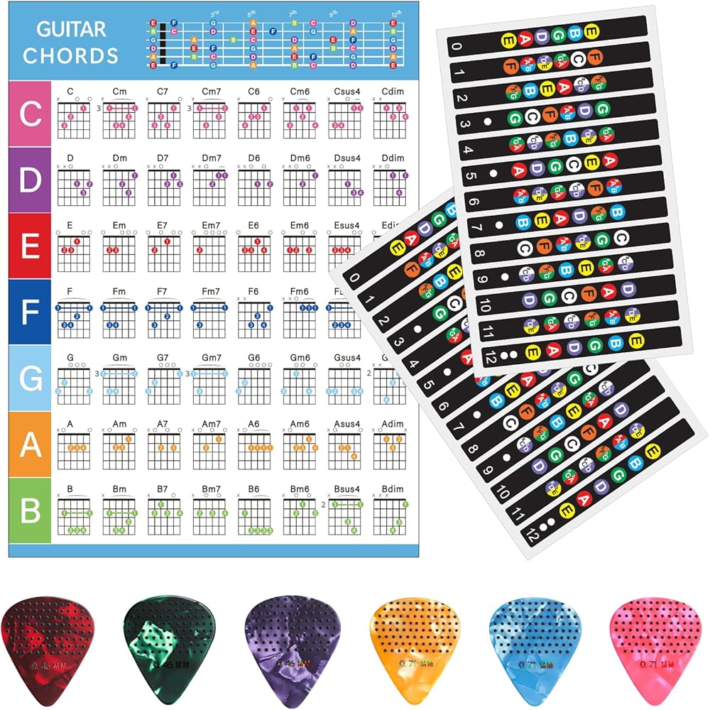 عبوات تعليمية رائعة: تتضمن العبوة عبوتين من ملصقات الجيتار الملونة، و1 مخطط وتر الجيتار و6 قطع من أعواد الجيتار غير القابلة للانزلاق (3 قطع 0.46 مم و3 قطع 0.71 مم)، هذه مجموعة مفيدة لمساعدة مبتدئي الجيتار على البدء بسرعة.