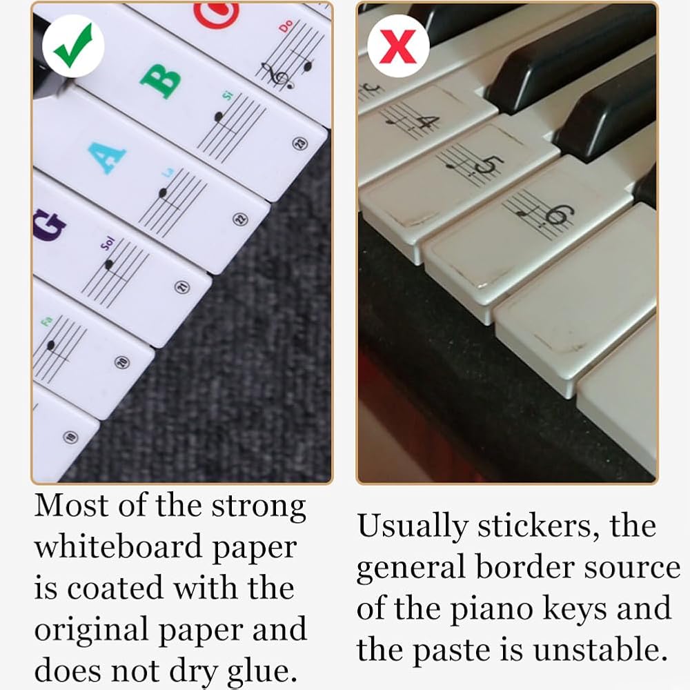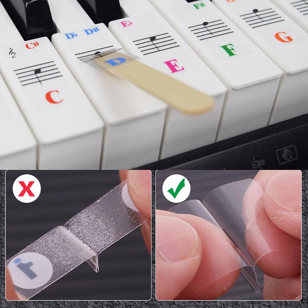 Easy To Install - Simply cut the stickers with scissors and peel them off to place on the piano keyboard. Press gently to secure them in place. when the posting position is not right, you can take it off and adjust it in place.