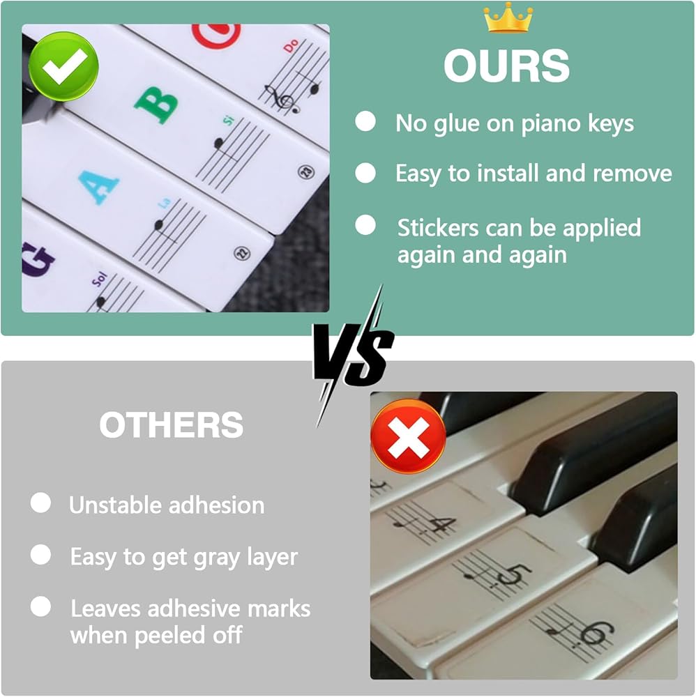 Soft PVC material, piano keyboard accessories will not disturb your fingers when playing. There is no glue left and these piano stickers are removable. Rounded edges prevent stickers from falling off the piano keys.