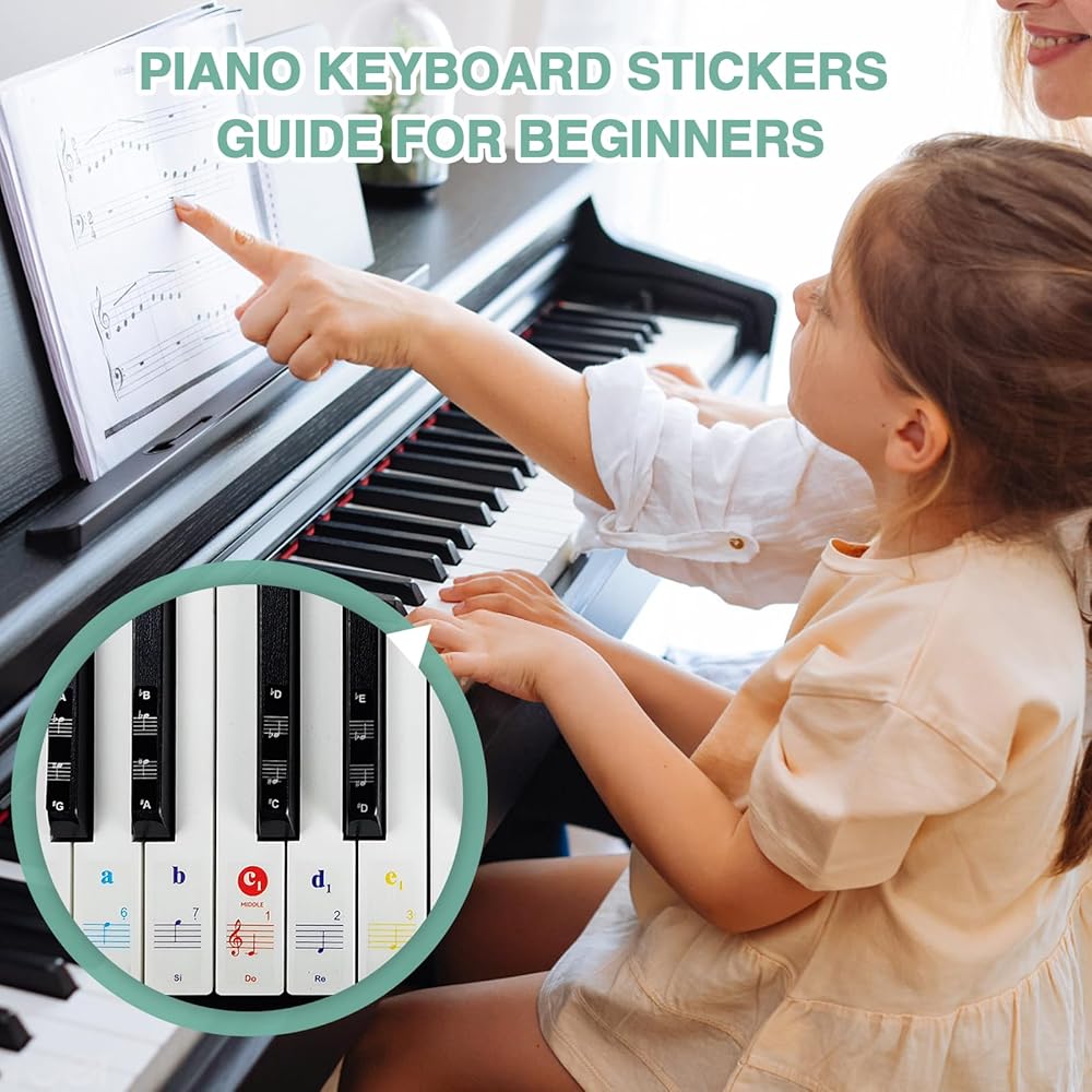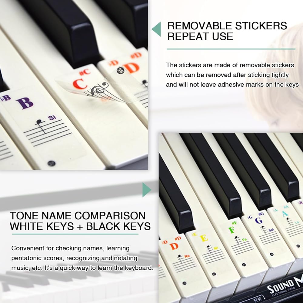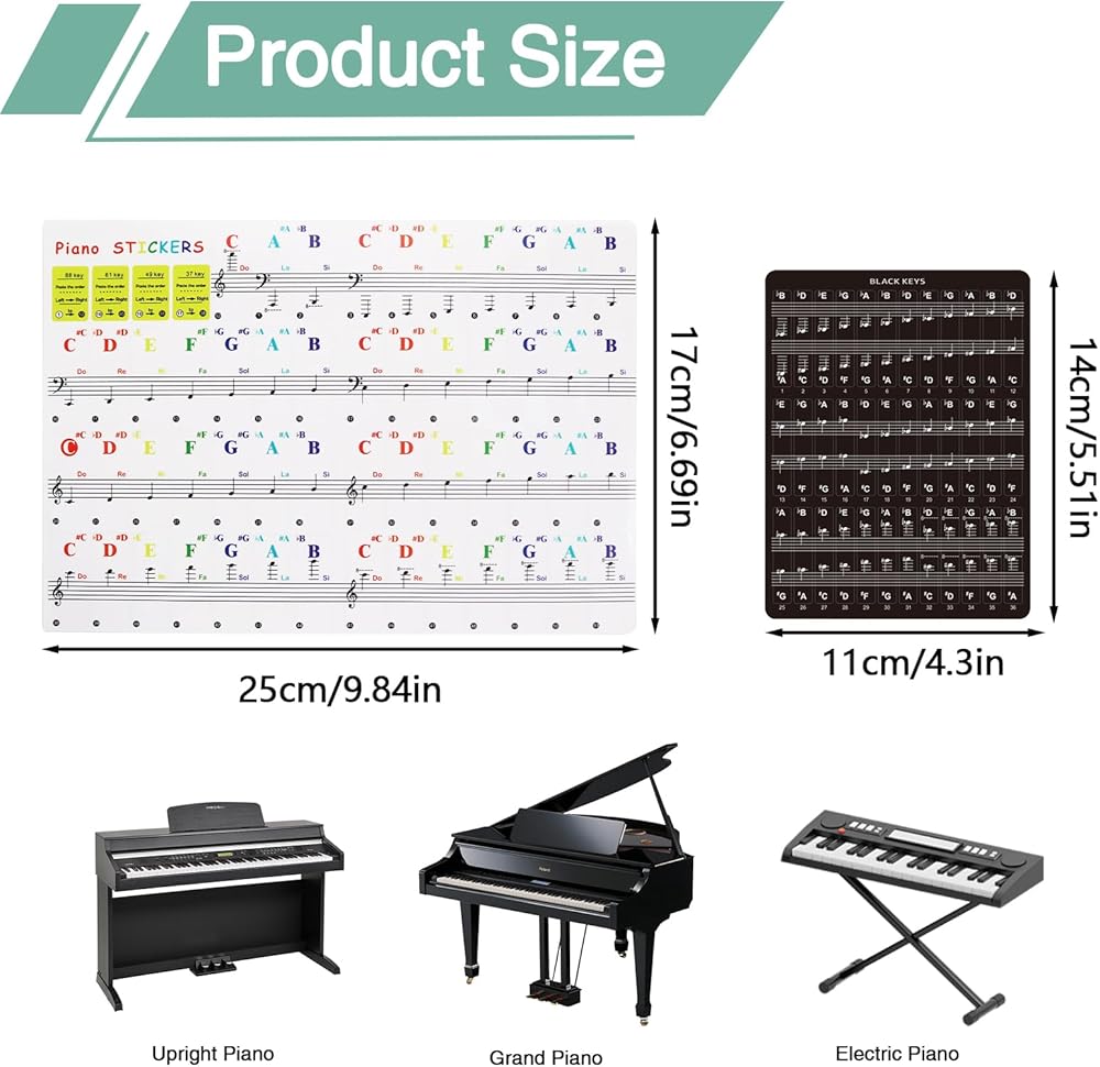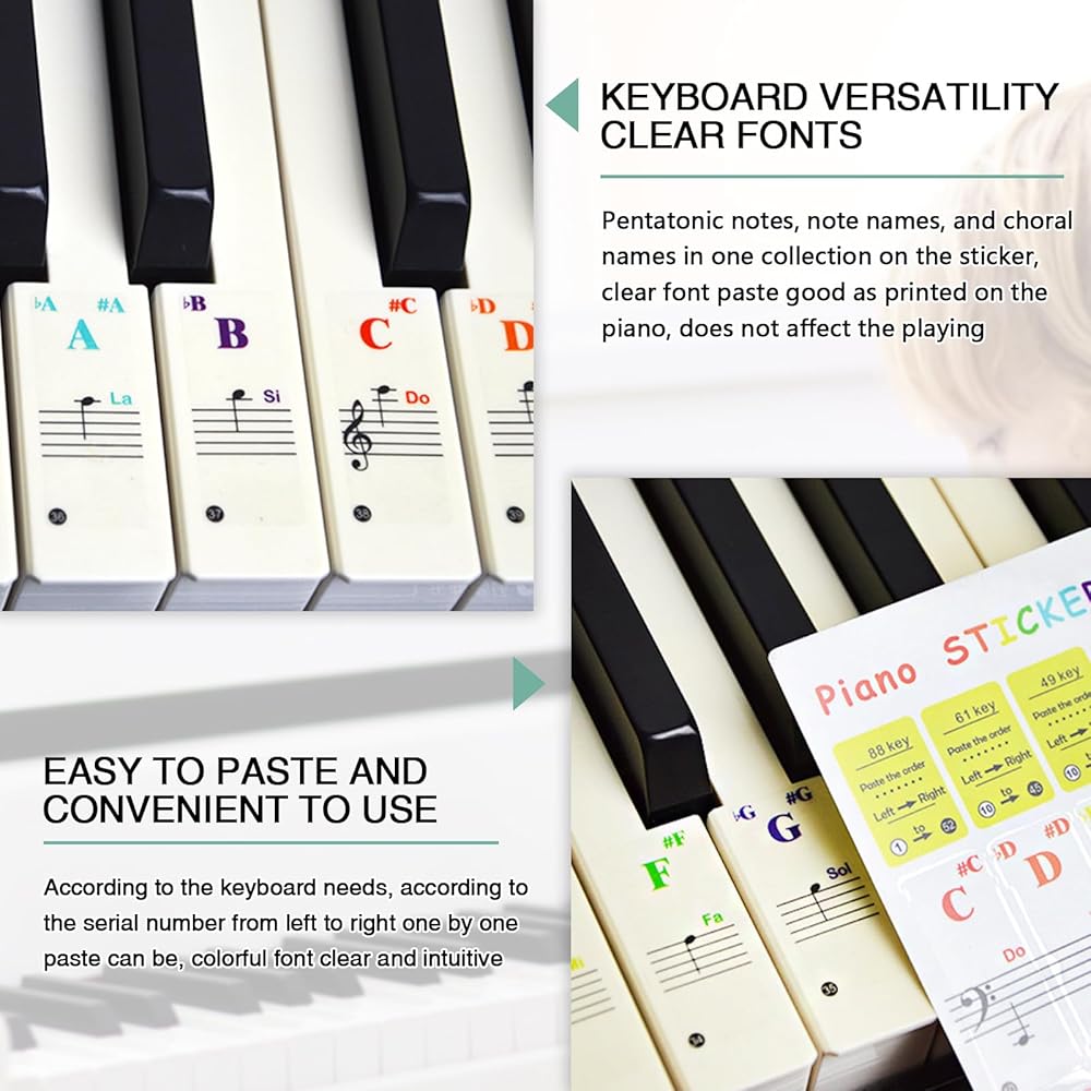 【Durable Material】Piano keys stickers are made of high quality PVC material with double layer coating, it is not easy to roll and fall off, easy to remove. Piano note stickers will not damage the keys, it is clear and easy to read, and waterproof, does not leave any sticky residue, always keep the piano keyboard clean and tidy.