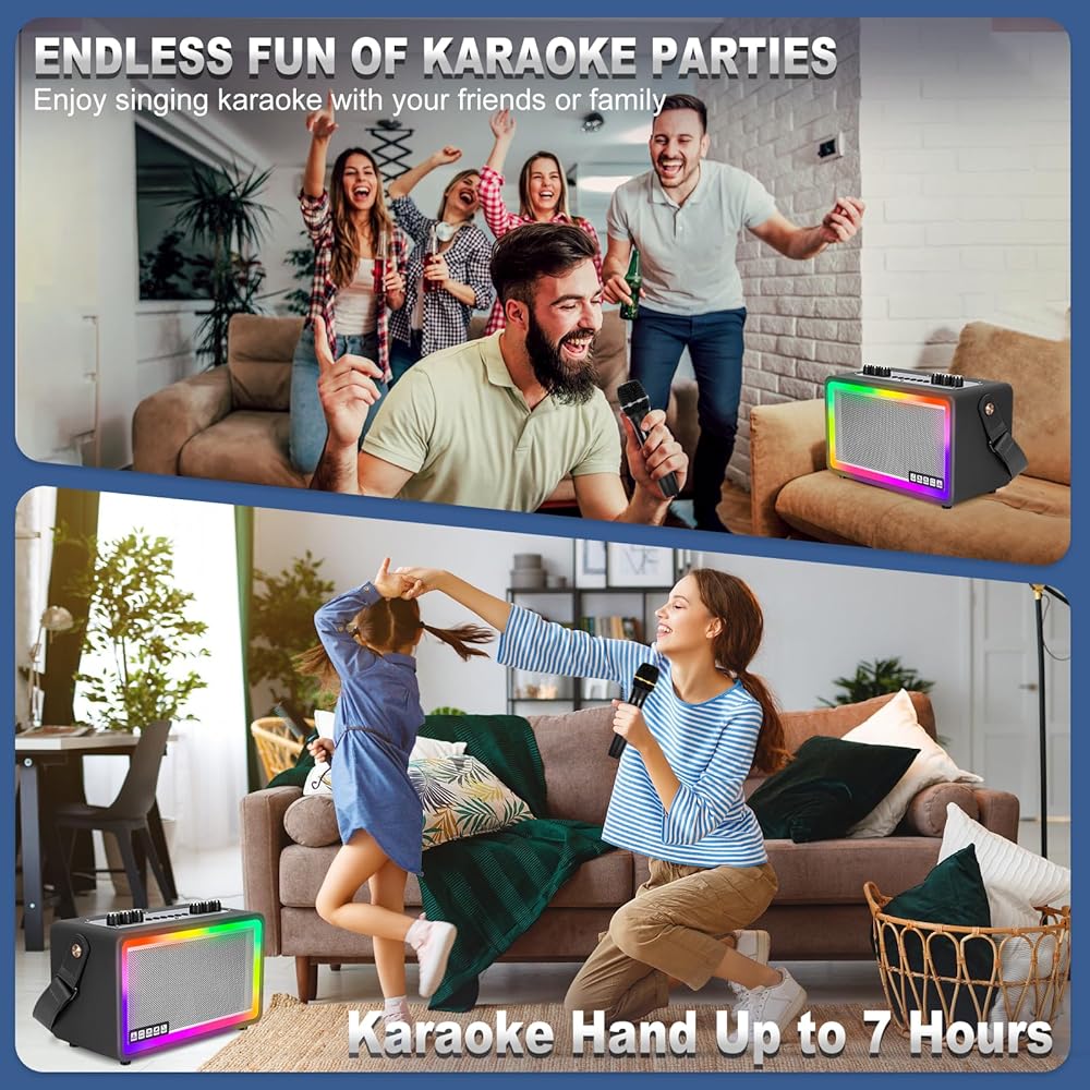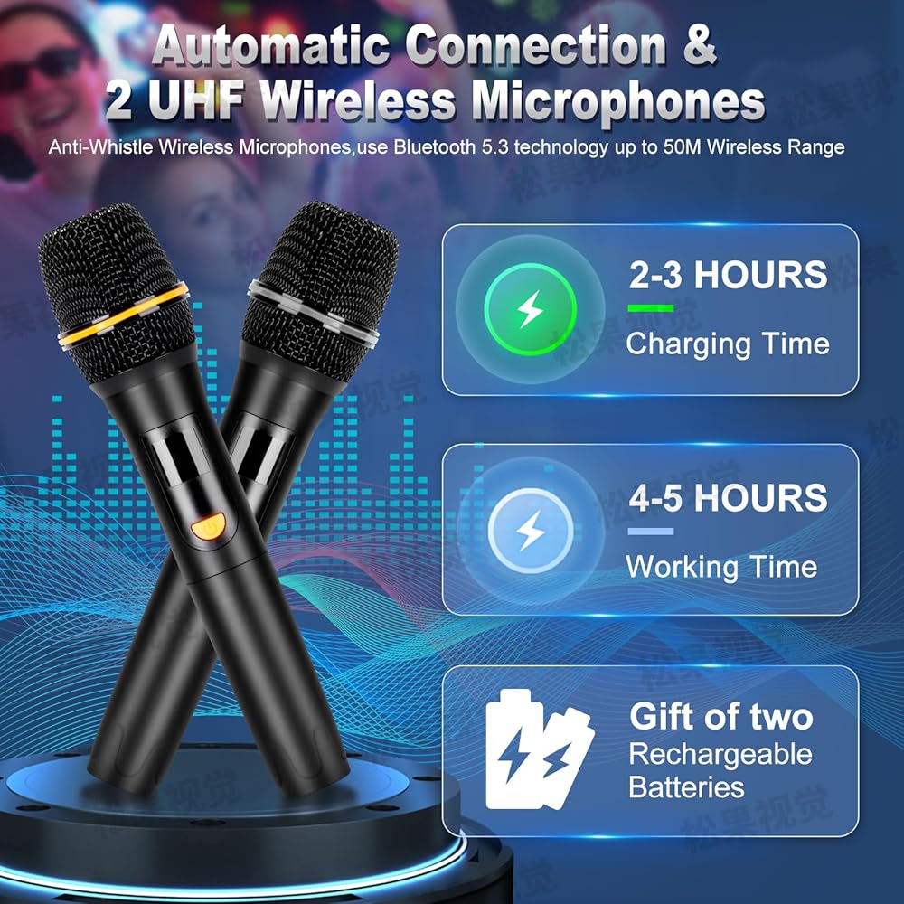 آلة كاريوكي، مكبر صوت كاريوكي مع 2 ميكروفونات لاسلكية UHF، آلة كاريوكي للبالغين نظام PA مع جهاز تحكم عن بعد والتحكم في مستوى الصوت وأضواء LED، مكبرات صوت بلوتوث محمولة تدعم TF/USB/AUX/OTG