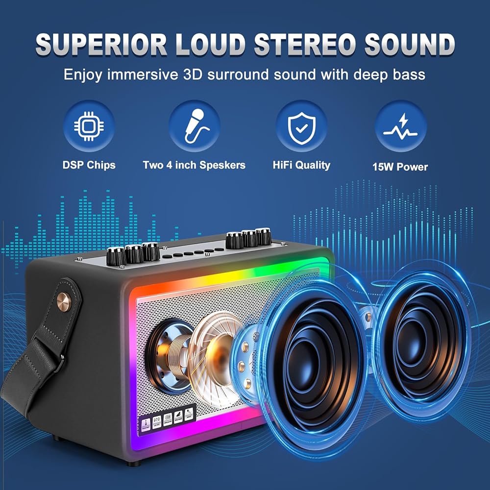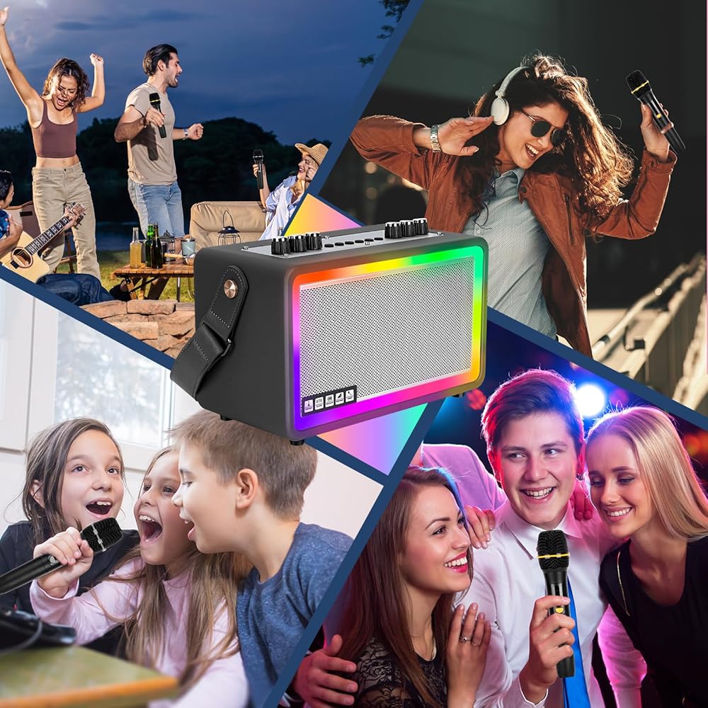 • آلة كاريوكي مع ميكروفونات لاسلكية UHF قابلة لإعادة الشحن: يأتي مكبر صوت الكاريوكي مع 2 ميكروفونات لاسلكية UHF قابلة لإعادة الشحن والتي تتصل تلقائيًا بالسماعة بمجرد تشغيلها. ويتميز بمكبرات صوت ستيريو 2 × 4.0، مما يوفر صوتًا محيطيًا بزاوية 360 درجة مع صوت جهير غني وصوت واضح وقوي دون تشويه، حتى عند مستويات الصوت العالية. سهل الاستخدام ويقدم أداءً صوتيًا استثنائيًا، وهو مثالي لأي جلسة كاريوكي