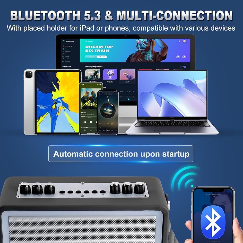 • صوت استثنائي مع مكبر صوت بلوتوث محمول 5.3: جهاز الكاريوكي المحمول الخاص بنا متوافق مع معظم الأجهزة الرقمية السائدة ويتميز بتقنية بلوتوث 5.3 عالية السرعة لنقل لاسلكي سريع ومستقر. ومع تعزيز مقاومة التداخل والنطاق الممتد، فإنه يضمن تشغيلًا سلسًا دون انقطاع. استمتع بصوت واضح ونقي وتجربة كاريوكي رائعة