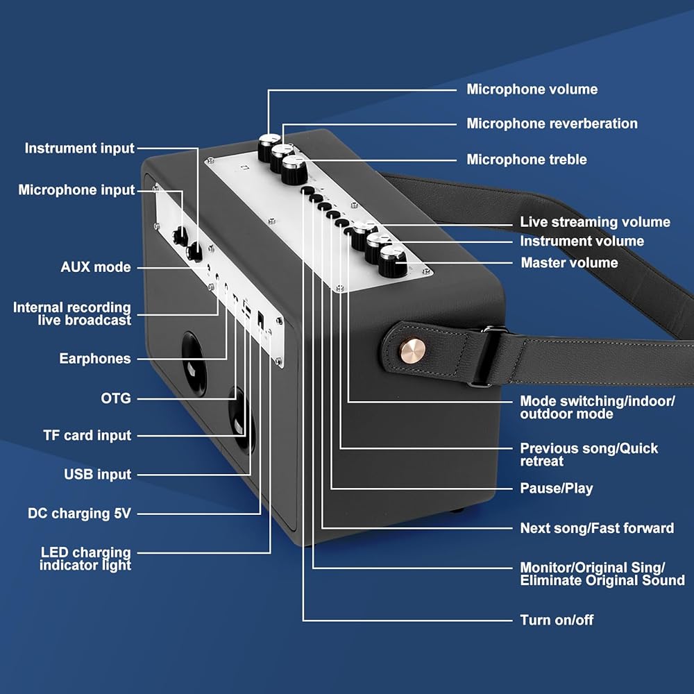 • مكبر صوت كاريوكي متعدد الوظائف: تدعم آلة الكاريوكي أوضاع التشغيل المختلفة وتوفر خيارات اتصال متعددة، بما في ذلك الأدوات المدمجة، والبلوتوث، والميكروفون، ومحرك USB، وبطاقة TF، والبث المباشر بدون فقدان OTG، وواجهة مباشرة لسهولة توصيل الموسيقى. كما أنه يتميز بمنافذ إدخال للأدوات، مما يسمح له بالعمل كمكبر صوت للجيتار الكهربائي والميكروفونات والمزيد. وظائفه المتنوعة تجعله الرفيق المثالي للترفيه