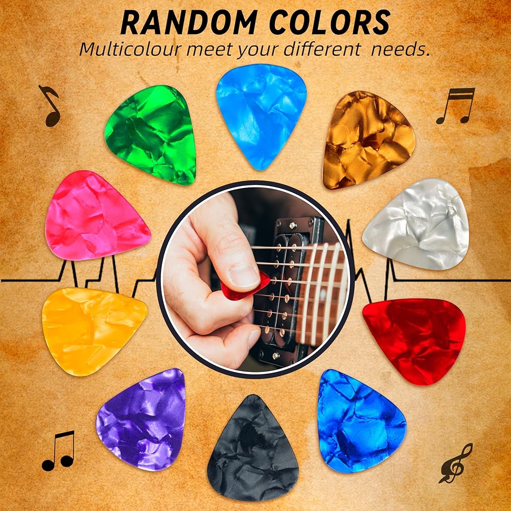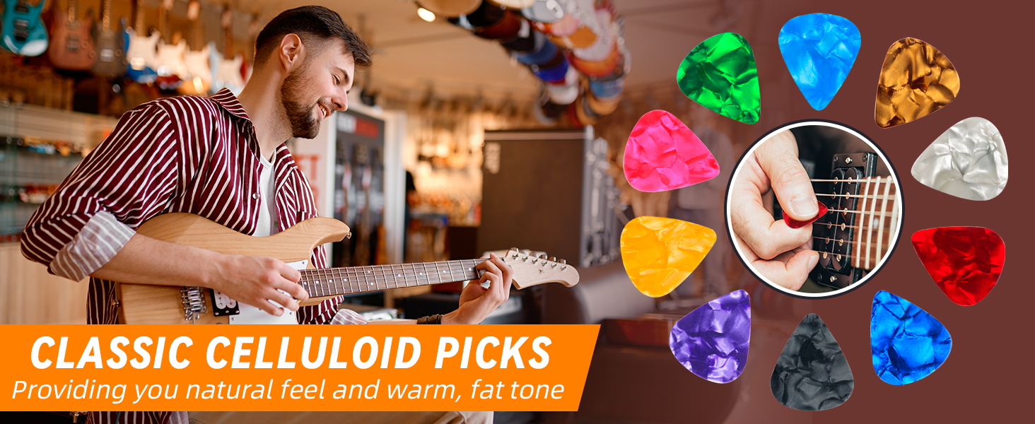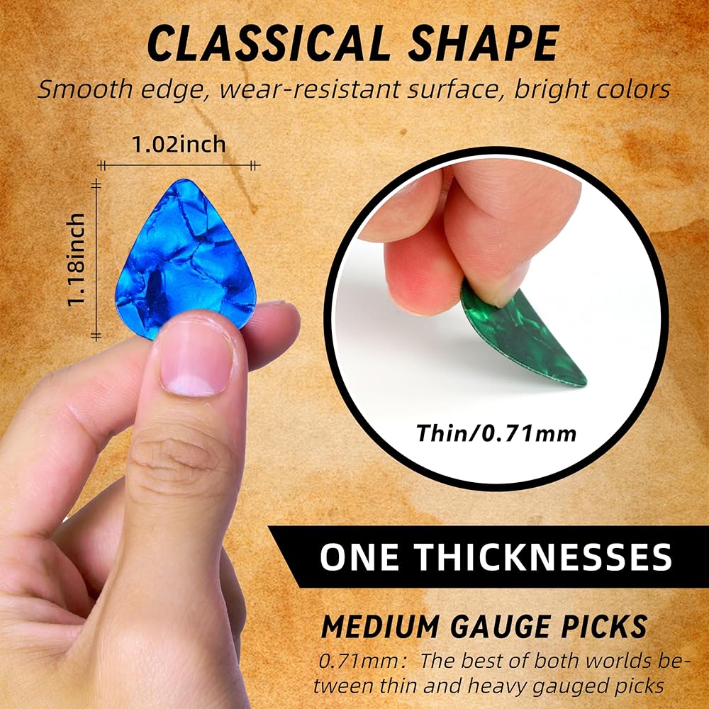 • الحجم: يتضمن 110 قطعة * 0.71 مم من أعواد جيتار السليولويد، يوفر إحساسًا طبيعيًا ونغمة موسيقية دافئة وسمينة.