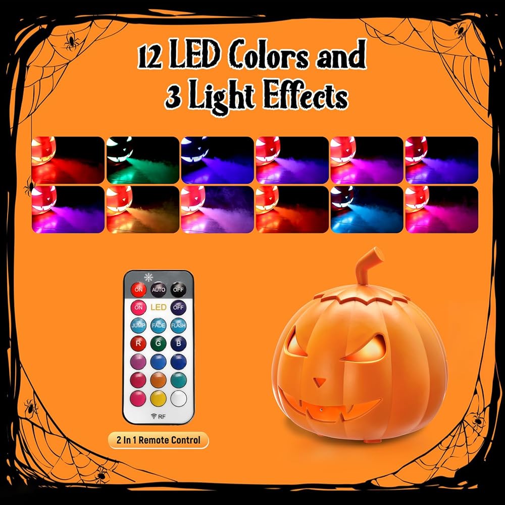 آلة ضباب TCFUNDY 800 وات مع أضواء، آلة دخان اليقطين مع 12 لونًا من أضواء LED، صانع الضباب مع جهاز تحكم عن بعد لديكور الشرفة الأمامية للهالوين، مسرح الحفلات المنزلية المسكونة